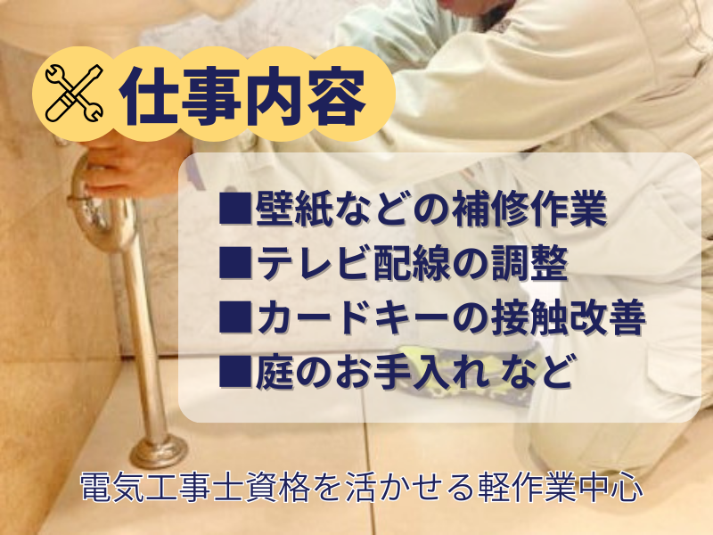 求めている人材 【必須】電気工事士資格をお持ちの方 年齢不問 <以下のいずれかに当てはまる方尚歓迎> ・DIY・機械いじりが趣味な方大歓迎 ・壁紙など内装のリペア経験がある方 ・水回り設備の修理経験がある方 ・手先の器用さには自信がある ・趣味が日曜大工 ・ボイラー技士資格者