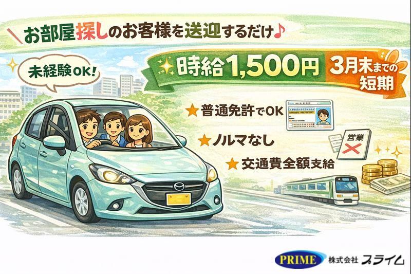 仕事内容 <令和8年3月までの短期スタッフ募集> 【おすすめポイント】 ・運転好きの方必見 ・スーツでの勤務 ・いろいろなお部屋をみれます 【お仕事の内容】 ・賃貸アパート・マンションを探しているお客様を、社用車(デミオまたは軽自動車)で物件までご案内していただくお仕事です。 ・不動産の知識は一切必要ありません。営業や勧誘もありませんのでご安心ください。 ・お客様と一緒にお部屋を見ながら、「この近くにはスーパーがあります」「駅までは徒歩〇〇分くらいです」など、地元ならではの情報をお伝えしていただけると喜ばれます。 【その他の業務】 ・ご案内がない日は、書類の届け出や空室のお部屋の写真撮影など、簡単なサポート業務もお願いします。