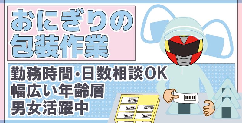 仕事の内容 【おにぎりの製造スタッフ募集!未経験OK♪】 ★年齢・経験・性別問いません★ ★勤務時間・勤務日数の相談可能★ スーパーでよく見かけるおにぎりをつくるお仕事です。 様々な世代が活躍している環境で、長期的に安定して働きたい方にピッタリです(^^)/ 【お仕事内容】 主なお仕事は、機械を使った巻き寿司の製造補助です。 作業の流れは以下の通りです (1) 機械の準備・セッティング →操作が簡単な機械のセットアップを行います。 (2) 材料の準備 →海苔や具材を準備し、炊きたてのご飯や酢飯を投入します。 (15kg程度の重さ) (3) おむすび計量形成包装ラインで具材の投入 (4) 品目ラベルおよび表示シール(原材料名、消費期限・賞味期限など)の準備 (5) 出来上がった製品を顧客ごとや出荷先ごとに仕分け (6) 機械洗浄・片付け →使用した機械の洗浄や作業エリアの片付けも担当します。 ※タッチパネルでの操作があるため、機械操作に抵抗が無い方に向いたお仕事です。 【働きやすい環境】 作業は一定の温度(19度)の場所で行うため、季節に関係なく快適です。 材料の取り出しで冷蔵庫や冷凍庫に行くこともありますが、 立ち作業中心なので体を動かすのが好きな方にオススメ! ほぼ機械作業なので、手順を覚えれば誰でもすぐに慣れます。 コツコツと集中して作業したい方、未経験も活躍中です。 【勤務条件】 ・シフト制 →週休二日制。 通常8:00~17:00の勤務ですが、出勤日数や時間は相談可能です! ライフスタイルに合わせて柔軟に働けます♪ 【待遇・福利厚生】 ・制服支給 →白衣、帽子、食品用シューズなどを支給します。 ・無料駐車場完備 →マイカー通勤も安心。 ・受動喫煙対策 →敷地内は禁煙です。 【職場の雰囲気】 年齢や性別、経験に関係なく、幅広いスタッフが活躍中です。 初めての食品製造でも、丁寧なサポートがありますので安心してスタートできます。 【こんな方におすすめ!】 ・体を動かすのが好きな方 ・長期間安定して働きたい方 ・モクモクとした作業が得意な方 ≪新しい福利厚生制度を導入致しました!!≫ 病気や怪我で働けなくなっても、給料の60%~86%を約3年間補償する給料補償制度を導入致しました!! クラリスで働く全従業員(規定有)を対象としています(*'ω'*) 詳しくは当社HPをご確認ください♪ ★本求人にご興味をお持ちの方は、応募する!より必須項目記載の上、 お問合せ下さい。 (お電話でのお問合わせ先:0120-67-3244 ※平日9時~18時00分)