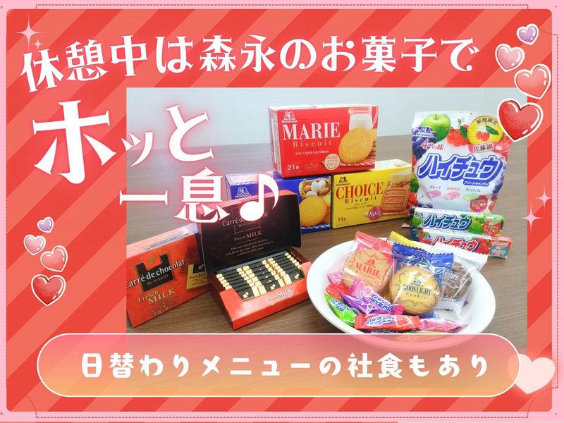 【保険制度】 雇用保険、労災保険、健康保険、厚生年金 待遇・福利厚生 【福利厚生】 〇賞与あり(年2回)  ̄ ̄ ̄ ̄ ̄ ̄ ̄ ̄ ̄ *1年未満の在籍者 ・・1万5000円(1回目) *1年未満の在籍者 ・・基本日給の10日分(2回目) *2年以上の在籍者 ・・基本日給の15日分(3回目以降) . 〇昇給あり  ̄ ̄ ̄ ̄ ̄ *年1回(規定の評価制度で決定) . 〇交通費支給  ̄ ̄ ̄ ̄ ̄ ̄ *車、バイク通勤のガソリン代を支給 ・・・1キロ以上距離がある場合) *電車、バス等の公共交通機関も支給 *無料駐車場あり . 〇社員食堂完備(当社一部負担)  ̄ ̄ ̄ ̄ ̄ ̄ ̄ ̄ ̄ ̄ ̄ ̄ ̄ ̄ *日替わりで4種類あります! ・・定食、丼ぶり、麺類、軽食 食品工場のため、 衛生上の観点により、食品などの 持ち込みを禁止としております . 〇食堂・休憩室フリーWifiあり  ̄ ̄ ̄ ̄ ̄ ̄ ̄ ̄ ̄ ̄ ̄ ̄ ̄ 〇制服貸与(クリーニング費用完全無料)  ̄ ̄ ̄ ̄ ̄ ̄ ̄ ̄ ̄ ̄ ̄ ̄ ̄ ̄ ̄ ̄ ̄ ̄ 〇正社員登用有(規定あり)  ̄ ̄ ̄ ̄ ̄ ̄ ̄ ̄ ̄ ̄ ̄ ̄ *契約社員として勤務後、 翌年から正社員になる方もいます . / 社員食堂等も完備しております! 昼食などは日替わりのメニューを 低価格で食事可能です! \ . <先輩スタッフにインタビュー!> . Q、この会社を選んだ理由は? A、高校生の時に お菓子作りにハマりました。 最初は難しくて苦手分野でしたが、 周りからアドバイスを貰い少しずつ 上達していくのが楽しかったので、 社会人になってもお菓子作りに 関わりたいと思い、入社しました。 . Q、仕事のやりがいは? A、親戚や友人など、周りの人が 美味しいと言って食べてくれるのは もちろんのこと嬉しいです。 以前立ち寄ったスーパーでは、 「こっちの製品と 森永の製品どっちにする?」 「森永が美味しいからこっち」 という親子の会話が聞こえ、 とても嬉しい気持ちになりました。 これからも美味しいと思ってもらえる 製品を作っていきたいです。 . *2013年入社 製造第一グループ(ビスケット)Aさん