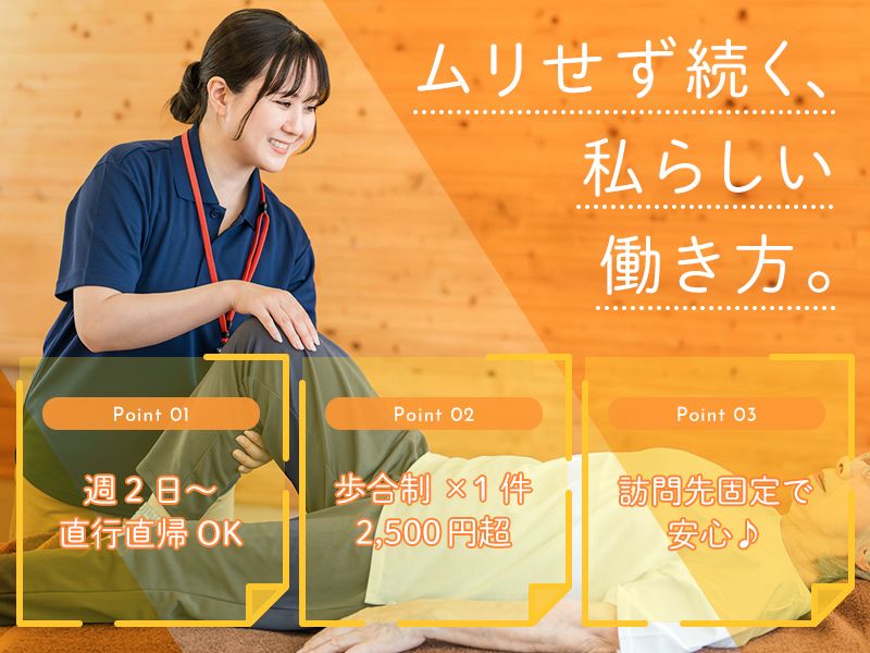 仕事内容 ・-・-・-・-・-・-・-・-・ \訪問先は完全固定で安心!/ 自由に働ける「あんまマッサージ指圧師」! ・-・-・-・-・-・-・-・-・ ✅業務委託で働き方原則自由! ⇒週2日~/平日のみ/午後のみなどOK ✅報酬は1件約2,500円〜約3,000円! ⇒1日7件で日給17,500円も可能! ✅マイカー移動/直行直帰OK ✅40~60代活躍中!ブランク復帰も歓迎! <仕事内容> お任せするのは、 医療保険を利用した、 在宅訪問マッサージのお仕事です。 あん摩マッサージ指圧師として 訪問先のお客様の施術をお願いします。 <施術の流れ> 血圧測定(20~30分)後、問題なければ施術を開始。 1件あたり30分程の施術になります。(平均7件を訪問) <訪問先> 仙台市青葉区中心(事務所より直線距離16km圏内) ⇒訪問先は完全固定です! 継続的な安定収入を見込めるだけでなく、 お客様と長く信頼関係を築けます! <主な対象者> ✓ 寝たきりや歩行困難の方 ✓ 脳梗塞の後遺症、パーキンソン病 ✓ 腰痛・浮腫などを抱える高齢者 ⇒医療的なケアが必要な方が多いため 専門的な知識や技術を学べます。