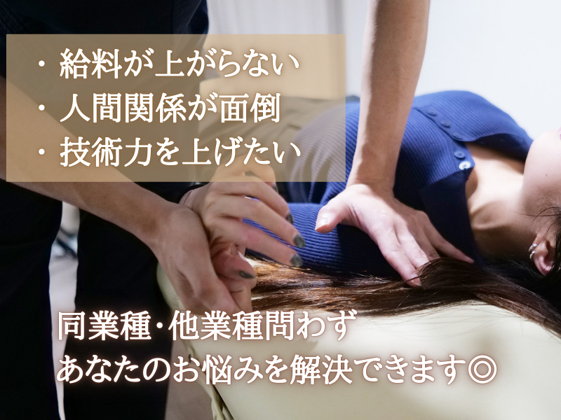 求める人材: 【必須条件】 ・誰かのために頑張れる方 ・想いに共感してくださる方 【歓迎条件】 〇完全未経験ok (看護師/介護士/保育士/アイリストなど専門職からの転職あり) 〇働きやすくやりがいのある仕事や職場を探している方 ○誰でも治せる技術力を手に入れたい ○大事な家族や友人を自分の手で健康にしたい ○常に学べる環境で働きたい ○高収入・早期デビューを目指したい ○チームワークを大切にできる ○将来的にオーナーになりたい ○エンターテイナーな方 ○コミュニケーション能力が高い方