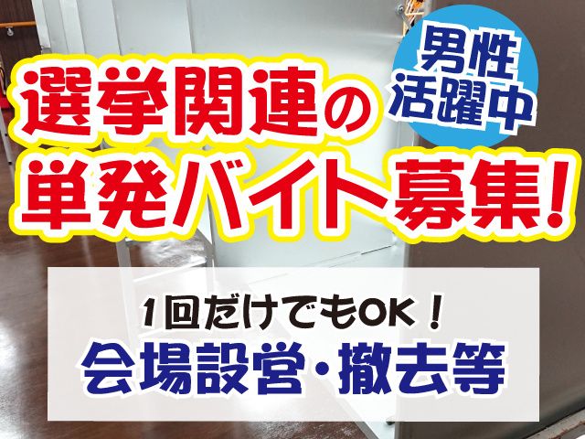 仕事内容 数日限定の単発アルバイト大募集! 日払いOK!全額日給保障! 未経験者歓迎のスポットバイト! 〈おススメポイント〉 〇期間限定の単発アルバイト 〇履歴書不要 〇登録から振り込みまでスマホ1つで完結! 〇全額日払いOK(手数料無料) 〇早終わりでも日給保障 〇男性活躍中のお仕事 〇友達同士の応募もOK 【単発アルバイトの仕事内容】 3日間の期間限定! 選挙会場にて、備品の積込作業や会場設営・撤去をお願いします。 未経験の方でもできる簡単なお仕事がほとんどです! 短期・単発アルバイトデビューもOK! 専門学生・大学生・フリーターなどなど様々な方が活躍しております。 短期・単発アルバイト、レギュラーワークとして働きたい方までみんな大歓迎です! この他にも都内を中心に一都三県にお仕事が毎日あります! 下記より当社の採用情報をご確認ください。 ▼採用ページURL▼ https://entori.jp/bigwork 〈勤務の流れもとっても簡単!〉 ・スマートフォンで前日までにシフト予約 ・お仕事内容確認 ※スマートフォン上での確認となります。 ・最寄り駅へ集合し、仕事先に向かいます ~応募後の流れについて~ 応募完了、弊社からメールをお送りさせていただきます。 迷惑メールに振り分けられてしまう場合もございますので、 ご確認をお願いいたします。 まずは登録からスタート!登録だけでもOK! 面接不要のWEB登録or来社説明会、お好きな登録方法選べます! ご不明な点はお気軽にお電話ください。 TEL/048-612-3948(採用センター直通) ※ご応募はお電話ではなく、WEBでお申し込みください。