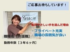 応募方法 ここまでお読みいただきまして、ありがとうございます。 ご応募は、『応募ボタン』にてお願いいたします。 <応募ボタン> 受付時間…24時間受付中!! ※ご応募内容を確認後、折り返しご連絡をさしあげます。 <採用選考スケジュール> ①応募 ②WEBでお仕事説明(面談)※対面相談可 ③仮登録完了(内定)※仮登録完了まで3日程度 ④1時間程度の動画視聴いただき、本登録完了 ⑤店舗からお仕事紹介します ※応募後、WEBで簡単登録(履歴書添付)をお願いいたします。 履歴書提出方法はご相談可能です。 ※ハローワークでお仕事をお探しの方も対象です。 ※入社日も応相談ですので、まずはご相談ください。 【会社概要】 会社名:株式会社やさしい手 事業内容:介護事業・コンサルティング事業 年商:約210億円 社員数: 6,018人(常勤1,459人非常勤4,559人) ご高齢の皆様がご自宅で暮らす上での不安やお困りごと、その一つひとつを安心にかえるために、皆様の立場になって生活のご支援をしてまいります。「住み慣れた家で、最期まで生きる」その想いを、私たちが実現します。 担当 採用担当