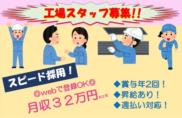 仕事内容 製造工場で流れてくる製品の検品となります。 <具体的には…> ・製品の表面を目視で検品 ・製品を種類やサイズ毎に梱包 ・自動マシンで袋掛けされる中めくれている個所を直す など \\ この求人のココがおすすめ // ✎ 未経験・ブランクのある方、大歓迎! 学歴・経験不問!特別なスキルも不要! ほとんどのスタッフが未経験スタート! 既存スタッフが優しくレクチャーしますのでご安心ください◎ もっと安定して働きたいという方には正社員登用あり! ✎ 給与週払い制度あり 急な出費にも対応できるのが嬉しい♪ もちろん月払いもOK!月収32万円以上可能でしっかり稼げる◎ ✎ リモート登録実施中&即日・当日登録OK 応募したその日に来社不要で登録完了♪ スグに働きたいという方必見!! ◆ 業界未経験者大歓迎 ◆  ̄ ̄ ̄ ̄ ̄ ̄ ̄ ̄ ̄ ̄ ̄ ̄ ̄ 以下の業界での勤務経験のある方も活躍中! ・自動車整備業界 ・物流・運輸業界 ・飲食業界 ・小売業界 ・サービス業界 ・アミューズメント業界 ・インフラ業界 ・ホテル業界 etc.