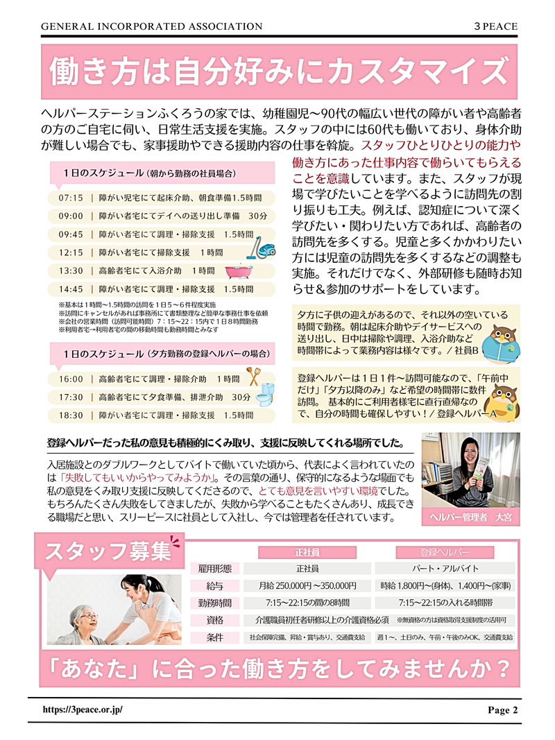 求めている人材 【求める人物像】 ①責任感の強い方 ②簡単なパソコン操作のできる方 ③自己成長を求める方 ④初任者研修修了過程以上の資格を保有し、現場経験1年以上の方