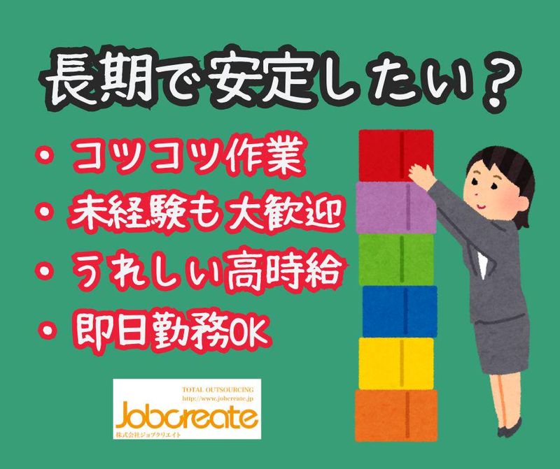 仕事内容 No.59618 / 万博終わったあと、どうしよう? 高時給の軽作業ないかな? そんな方にピッタリのお仕事ありますよー^^ まだまだ積極採用中です♪ \ ■高時給1400円×キレイな物流作業でかんたん軽作業■ 高時給で効率よく稼げるお仕事お探しのあなた!! ★お仕事内容★ ハンディー、ハンドリフトやカゴ車を使って、 ピッキング作業をしていただきます♪ 部署が 2つありまして、 ①ドラックストア商品 ②お酒・飲料など それぞれケース単位やバラ単位のピッキング作業になります! カンタンな作業ばかりです☆ 未経験の方がほとんど! 担当者も優しく、業務も丁寧に教えてもらえますよ♪ 倉庫作業に慣れてる方も、 未経験者の方もどちらも大歓迎です! 早朝勤務なので、朝得意な方大歓迎です! 午後はゆっくりプライベート充実できます♪ まずは現場見学にいってみませんか? 働き方も自由!まずはお気軽にご相談ください♪ ぜひぜひエントリーお待ちしております☆ ◆おすすめポイント◆ ・20代、30代、40代、50代の軽作業好きな方!! (シニアの方も大歓迎) ・キレイな物流倉庫で働きたい方! ・高時給で効率よく稼ぎたい方♪ ・モクモク作業が得意な方! ・早朝が得意な方♪ ★職場環境★ 男女比 男性7:3女性 各現場に冷蔵庫や自販機も完備されております! 作業の合間も水分補給しっかりしてもらえますよ! また各フロアに喫煙室もあり、1階には売店もあります♪ 事務所にお湯ポットやレンジなどもあり、 お昼もゆっくり休めます! 服装自由で、働きやすさ重視の方は必見ですよ☆ ~月収例~ 時給1,400円×8時間×21日=235,200円+残業代+交通費全額支給 ◇休日◇ 月曜日~日曜日のうちシフト制 週3日~週5日勤務OK! 基本的には土日・祝日・大型連休も稼働しています! 出勤していただける方大歓迎! ※ドラックストアの部署は日曜日お休みです^^ (お正月1/1はお休みです!) まずはご相談ください♪ ◇資格・経験◇ 未経験OK! まずは現場見学にいってみませんか? ◇交通費◇ 実費全額支給(規定あり) *マイカー・自転車・バイク・徒歩通勤OK♪ *公共交通機関の場合は交通費全額実費支給 ◇アクセス◇ ニュートラム「ポートタウン西駅」から徒歩15分 ニュートラム「ポートタウン東駅」から自転車で5分 ニュートラム「フェリーターミナル駅」から車で3分 車・バイク・自転車通勤OK! まずはご相談ください♪ **-** ジョブクリエイトは 大阪府高槻市にある派遣会社です。 製造、倉庫内、梱包などの軽作業はもちろん オフィスワークや販売促進など 豊富な人材サポートを行っております! 阪急高槻市駅から歩いて3分♪ 来社不要のWEB面談も実施しております! ご希望の方はお気軽にお申し付けください☆ **-** <自宅から面接ができるWEB面接実施中> 来社不要のスマホ面接もございます! ご自身のPCやスマホでご自宅からかんたんに面接♪ ▽WEB面接についてはこちら WEB面接は誰でも出来ますか? <apアプリポイントプレゼント!> 日々のお仕事でポイントがたまり、 日用品や家電、食品、旅行券などの 商品と交換していただけます! ▽apアプリについてはこちら 社内連絡専用メッセンジャーアプリについて ※土日祝日に頂いたご応募に関しましては、 翌営業日に順次対応させていただきます。 **-**