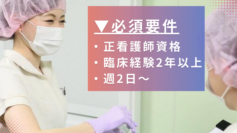 求めている人材 <必須要件> ・正看護師資格をお持ちの方 ・臨床経験2年以上の方 ・週2日以上ご勤務頂ける方 <歓迎要件> ・オペ室経験者優遇 ・土日ご勤務頂ける方