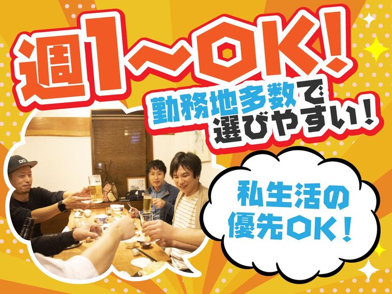 シフト制 勤務時間詳細 実働時間:1日あたり4時間 平均勤務日数:1ヶ月あたり4日 〜 20日 9:00〜13:00 または 13:00〜17:00 どちらかの勤務が可能です! ※4時間勤務の募集です ※早く終わっても日給全額保証 ★週1⽇〜勤務OK 「平⽇だけ勤務したい」 「⼟⽇だけ勤務したい」 など働き方は完全自由! ★もちろん週5⽇勤務も可能です! ★お気軽にご相談ください!