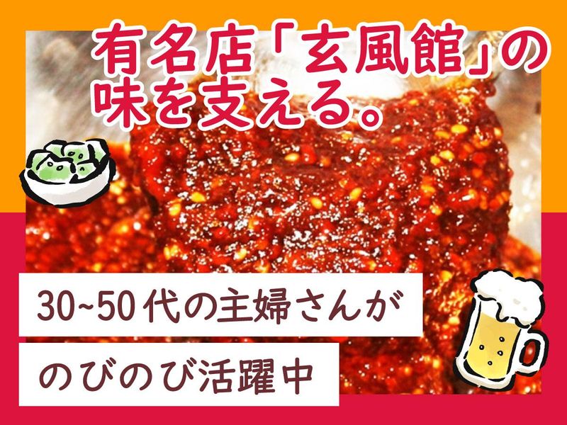 仕事内容 / 「お互いさま」が合言葉♪ 家庭優先で、無理なく働けるお弁当づくり \ 全国にファンを持つ焼肉専門店「玄風館」。その自慢の味をお弁当としてお届けするのが私たちの役目です。 特別なスキルや難しい調理はいりません。ただ、「衛生的に、丁寧に、まごころを込めて」。 そんな当たり前のことを大切にできる方なら、どなたでも大歓迎です。難しい調理や接客は一切ないので、コツコツ・モクモクと自分のペースで取り組めますよ。 ⭐お仕事内容 ――――――――――――――――― ✅焼肉弁当のご飯を詰める ✅お肉を焼く ✅副菜を彩りよく盛り付ける ✅包装する これらの作業を分担して進めます。一人ひとりの得意に合わせてお任せしていきます。 *お肉を焼く際は「ジェットオーブン」という自動の機械を使うので、焼き加減の難しい判断はありません。 マニュアル通りに温度や時間を設定すれば、誰でも美味しい焼き加減に仕上げられます。 \未経験でも安心の理由/ 最初はお弁当のご飯詰めや、できあがった副菜(おかず)をカップに詰める盛り付けなど、家事の延長でできる簡単なことからお任せします。 役割分担は毎朝のミーティングで決まるので、迷うこともありません。常に周りに社員やベテランさんがいるので、わからないことはすぐに聞ける環境です。 ⭐やりがいや大切にしていること ――――――――――――――――― ●この仕事のやりがいは… 工場までお弁当を買いに来てくださるお客様や、店舗のスタッフを通じて「ここのお弁当、美味しかったよ!」という声が届くことがあります。 自分の盛り付けたお弁当が、誰かの楽しいお食事の時間を作っていると実感できる瞬間です! ●大切にしていることは… 「有名店の味」を守るため、衛生面は徹底しています。 手袋の着用や、盛り付け前に一定の温度まで下げるルールなど、守るべきことはきっちり守って作業を進めています。 また、野球の試合がある日などは製造数が増えるため、チーム全員で連携してテキパキと動いて対応しています。 ⭐職場の雰囲気について ――――――――――――――――― 現在、30代から50代の女性を中心に、計6名のスタッフが活躍中!ママさん、中高年活躍中で15年以上働くスタッフも! 「子供が熱を出して……」という時も、みんな「困った時はお互いさまだよ」と笑顔でカバーし合う文化が根付いています。 休憩室には冷蔵庫や電子レンジ、ウォーターサーバーも完備。お昼休みにはみんなで雑談したりと、肩肘張らずに過ごせる穏やかな雰囲気です♪ ⭐サポート担当の社員に聞きました (工場主任:安部さん) ――――――――――――――――― 私も実は「働きやすいから一緒にどう?」という紹介で、未経験のパートからはじめたひとりなんです。 前職はトリマーという全く別の仕事でしたが、周りの方々が本当に温かかったから、続けられています。 今では主任として現場を支える立場になりましたが、最初はみなさんと同じ「新人さん」だったので、気持ちを理解して丁寧に教えていきたいと思います。 わからないことがあれば遠慮なく聞いてくださいね!