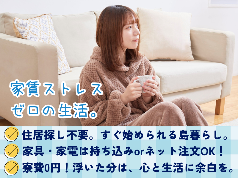 求めている人材 明るく丁寧な応対ができる方 ・高卒以上 ・経験不問 ・業界未経験の方歓迎 ・職種未経験の方歓迎 ・第二新卒歓迎 ・20~50代の幅広い年齢層のスタッフ活躍中 日本語での接客業務を担当していただきます。 海外出身の方も活躍しています ・日本語能力検定N2以上をお持ちの方 <こんな方にピッタリ> ・離島で自然に囲まれた生活を始めたい ・接客の経験を活かしてキャリアを築きたい ・生活費を抑えて、趣味や学びにお金をかけたい ・一人ではなく、安心できる仲間と働きたい ・SNSで発信できる暮らしの“ネタ”を見つけたい