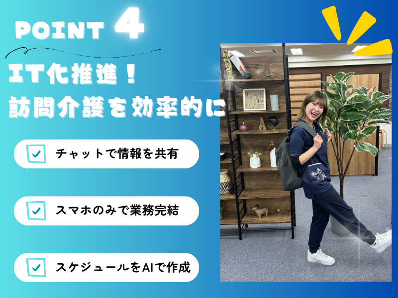 仕事内容 \資格取得支援ではじめての訪問介護を後押し!/ 未経験、無資格でも専門カリキュラムでキャリアチェンジ。 その名も「ケアルーキー」 入社から2か月間は社内研修プログラムを通して資格取得をサポート。 訪問介護の基礎知識から実務まで、 段階的にしっかり学べる育成ポジションです。 配属先は自宅から通勤1時間圏内の神奈川県内の事業所。 神奈川の街を走りながら、誰かの人生をちょっと明るくする仕事。 数カ月後、あなたは訪問介護のプロとして、 地域に欠かせない存在になっている! ◆◆◆◆◆◆◆◆◆◆◆◆◆◆◆◆ <アカリエのオススメPOINT> ◎年休126日&日勤のみ! ◎ネイル・髪色・ヒゲ・服装自由! ◎株式会社ツクイの100%出資子会社♪ 【ホームヘルパーってどんな仕事?】 ホームヘルパーは、介護サービスを必要としている方の自宅に訪問し、 日常生活における手助けをするお仕事です。 食事、排せつ、入浴、家事などの介助(身体介護・生活援助)、 お客様の心身や生活を”自立支援、重度化防止”の視点から支えていきます! 介護福祉士などの資格保有者や、 定められた研修を修了した人しか従事することができない在宅介護の「専門職」です◎ 【訪問介護の魅力】 「ありがとう」や「来てくれて助かった」 「あなたが来てくれて嬉しい」という感謝の言葉を直接いただけることで、 自分が役に立てているということをダイレクトに感じることができます。 一方的に支えるだけではなく、時にはお客様から元気や活力をもらったり、 背中をぐっと押してもらえたりすることがあります。 これは、お客様と1対1で関係を深めていく訪問介護ならではの醍醐味です! 【一日の流れ】 ▼08:30 出社(コース確認、ご家族・ケアマネからの連絡確認) ↓ 移動15分 ▼09:15~10:15 訪問(掃除)1件目 ↓ 移動15分 ▼10:30~11:30 訪問(入浴介助)2件目 ↓ 移動15分 ▼11:45~12:45 訪問(調理)3件目 ↓移動15分 ▼13:00 事業所戻り ▼13:00~14:00 休憩 ↓ 移動15分 ▼14:15~15:15 訪問(掃除)4件目 ↓ 移動15分 ▼15:30~16:30 訪問(入浴介助)5件目 ↓ 移動15分 ▼16:40 事業所戻り・記録・振り返り・担当お客様の情報確認・サービス提供責任者への報告 など ▼17:30退社 【入社後の流れ】 ■1・2ヶ月目: 介護初任者研修取得(座学・技術)・訪問介護基礎知識 ※神奈川県内、主要事業所にて研修 ※JR私鉄等・2路線乗り入れあり駅近の事業所 ■3ヶ月目:神奈川県内の事業所に配属:現場同行研修スタート ※自宅から通勤1時間圏内の神奈川県内の事業所 【アカリエの魅力♪】 ★未経験・無資格からでも正社員に 必要な資格は入社後に会社の負担で取得可能です♪ さらに、資格取得後も不安がなくなるまで、同行研修を実施しているので安心◎ ★頑張りをきちんと給与に還元 ケア時間や営業件数に応じて5段階の評価制度を導入。 基本土日休みですが、ケアに応じて出勤した場合は1日4000円の土日手当も支給します♪ ★社員の成長をサポートする多彩な研修 訪問介護に必要な知識や技術、 姿勢を習得できる多種多様な研修をご用意しており、 それぞれのスキルに合った研修が受けられる体制です。 ★新店続々展開中で早期キャリアアップが目指せる 1年間に続々と新規事業所を開設している「A-Smile」。 ポジションが増えており、スピード感を持ってキャリアアップを目指せます。 例えば、、、 20代後半女性…2023年9月ヘルパー入社⇒2024年1月サ責⇒2024年6月事業管理者へ 30代前半男性…2023年8月ヘルパー入社⇒その後、資格支援制度使って介護福祉士を取得⇒2024年6月サ責に 30代前半女性…2023年7月ヘルパーとして入社⇒2023年12月オープン事業所の立ち上げでサ責として異動 など、多くの社員が当社で新たなキャリアをスタートさせています! ★IT化で訪問介護をもっと効率的に *チャットツールを使用してスタッフ間の情報共有を迅速に *ペーパレス化を推進!スマートフォンのみで業務を完全解決 *お客様情報などを介護ソフトで一元管理 *AIにより訪問スケジュールを自動作成 *活動記録やお問い合わせ情報をアプリで管理 お客様宅への入室・退室は、スマートフォンのアプリから報告可能で、 支援内容の報告や気づき等の記録もアプリ内で完結できます◎ そのため、訪問するお客様の時間帯によっては直行直帰もOK! 【風を感じながら働く爽快ワーク!】 移動は自転車だから、気分もリフレッシュ♪ 働きながら健康も手に入る一石二鳥のお仕事です。