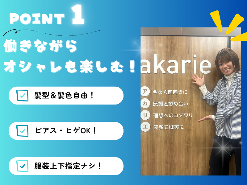 職場環境 アカリエでは訪問介護の様々な課題解決に向けて若手人材が活躍し、 安定したサービスを提供できると同時に社員がより働きやすく、より成長できる環境を整え、 すべての方の笑顔のため、新しい取り組みに挑戦し続けています!