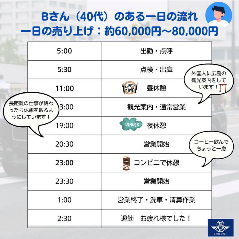 仕事内容 人柄・人物重視の採用/ ✅最低保証給与あり!30万円〜 ✅入社の100%が未経験のご応募! ✅出勤は月に12回でOKなので、自分の時間を作れます ✅広島県No.1のブランド力 ✅会社説明は履歴書なし、私服OKです! - ⭐つばめ交通で働くメリット!/⭐ ✅未経験からでも関係ない!頑張った分だけ稼げます! 安心の給与補償!さらに保証給与UP! ※入社後4ヶ月間:保証給300,200円(12,300円/日、月24日まで出勤+交通費5000円(月20日以上出勤で付与)) ※2ヶ月で独り立ちできた方には早期卒業祝金 ※2回(7月・12月) ✅ワークライフバランスが叶う環境! ★夜勤なしも可能★ タクシーは深夜のお仕事がイメージされますが、 当社では地域の方々の利用も多く送迎サービスも多く、 日中のお仕事も沢山あります! ✅社内雰囲気が良い!仕事を通して多くのお客様から喜ばれる環境! ★広島で選ばれるつばめ交通のブランド力★ 広島県タクシー協会での好感度ランキング、圧倒的No.1! 「つばめ交通さんのタクシーにしか乗りたくない!」 「つばめ交通の乗務員さんはどなたもいつも優しくて安心できます」 リピーターでご利用いただくのは、ご高齢の方も多いですが、 そのようなお客様のお声を大切にしていきたいと考えてます。 - ✬つばめ交通では、 未経験者のみの採用を行っております。 お客様に選ばれる仕事を行うことを、 共に目指していきませんか? ✬キャリアチェンジも可能! 入社後は、タクシードライバーとして経験を積んだ後、 ハイヤー・貸切バス・営業など、希望や適性に応じてキャリアチェンジも可能! 将来的には、接客スキルを活かしたVIP送迎や観光分野での活躍も目指せます。 一つの会社で多彩なキャリアが描けるのが、当社の魅力です。 ✅【仕事内容】✅ タクシー乗務員業務をお任せいたします。 ⭐<お仕事の詳細>⭐ 担当エリアは、広島市内が中心となり ご予約のお客様を中心とした送迎をお願いします。 また全車両、ナビ・ドラレコ・バックセンサーを 完備しています。 ――⭐ 資格取得をサポート ⭐―― 研修中、二種免許や大型免許の取得も目指します。 普通免許があれば、10~12日程度で取得可能。 費用は全額会社が負担します。 ※入社後2か月で独り立ちできた方には 「早期卒業祝金」を支給します ※全車両、ナビ・ドラレコ・バックセンサーを 完備しています ○高待遇でお迎えします! ○未経験者のみ採用!普通自動車免許で応募OK 【勤務地について】 入社後1年間(訓練期間を含む)は、 本社所属(しっかり業務を習熟するため)。 ・以後は自宅に近いほうの営業所に希望を出すことができます。 ━━━━━━━━━━━━━━━ 活躍中の社員の声を集めました ━━━━━━━━━━━━━━━ ✅<新人社員の声>✅ ●入社2023年4月3日 T.Kさん 東京から初めて広島に来られた男女二人組の観光客でした。 そのお客様をホテルまで送迎する際、広島の人気の お好み焼きのお店や翌日に行かれる宮島観光の 役立つ情報などを紹介しました。 同じ日の夜、GO配車でまた同じお客様に偶然に遭遇し、 市内中心部からホテルまで送迎した際、お客様から 『運転手さんに言われたお好み焼き屋で食べたけど すごく美味しかったし、とても広島を楽しめました』 と、笑顔で言われました。 私の言葉一つで広島を好きになって頂くことに少しは 影響するのだと実感しました。 ●入社2023年7月3日 A.Kさん 一人乗務して運転も広島の地理もままならなかった私ですが、 教育訓練課の皆様に最後まで4ヶ月近く粘り強く 教えていただいたことです。 大変にお世話になりました。 また、独り立ちした後も、教育訓練課の方並びに 先輩方に気にかけていただいて、多くのことを 教えていただいており、とても感謝しております。 一つ一つ教えて頂いたことを守り抜いて、 つばめ交通の乗務員として恥じぬように 頑張りたいと思います。 ●入社2023年11月6日 T.Tさん 私が入社して感動、嬉しかった事、 『お客さまからつばめ交通をお褒めいただける事』 私個人として、お客さまから特別にお褒めいただいた事は ございませんが、毎日、『つばめ交通』については、 お褒めの言葉や感謝の言葉をいただいております。 具体的な言葉としては、つばめさんは優しく、 誰が来られても丁寧で親切で助かっていますと 言ってくださることです。 乗務中、疲れていてもこのような言葉をお客様から頂くと、 とても嬉しく疲れも和らぎます。