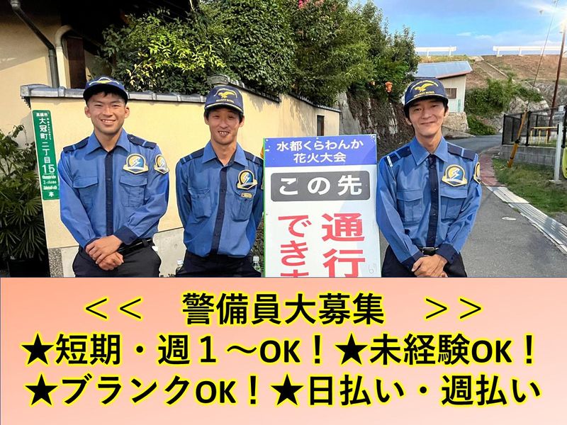 仕事内容 ⳹日給保証・入社祝い金あり★⳼ ⳹日払いOKでスグ稼げる★⳼ ⳹短期・週1日などシフト自由★⳼ ⳹60代・70代も活躍中★⳼ 定年後も頑張るミドル・シニアさん応援◎ 「シニア手当」を付与! //////////////// <電話でのお問い合わせ> 080-4563-5272(採用担当)まで //////////////// 【仕事内容】 イベント会場やスーパーの駐車場などで、人々の安全を守るお仕事です! ~お仕事例~ ●イベントでの警備 ●工事現場などでの交通誘導 ●駐車場での車誘導 など ◤ 未経験の方も大歓迎! ◢ まずは事前研修からスタート♪ 業務に必要な知識を身に付けてから、自信を持って現場デビューできます! 交通警備は皆さんの安心・安全を守る事を欠かせない大切なお仕事! □警備の基本 □報告について □警備日誌記載の仕方 □誘導棒の使い方・白旗・赤旗等の使い方 など、イチから丁寧にお教えします! ◤ 無理なく働ける! ◢ 現場は常に3~4名のチーム制! みんなで休憩を回すので、2~3時間に1度休憩があります◎ 一人ひとり、できるだけ負担が少なく働けるよう環境作りに努めています! *<当社で働く皆様にも安心を>* 警備をすることで地域の方の安全や安心を守ることはもちろん、 スタッフにも安心して続けていただけるように、待遇面や福利厚生の改善を行っています。 スタッフの声から生まれた待遇もあり、現場目線を忘れず、日々進歩する事を目指しています。 <待遇例> ・雨天時(荒天時)の給与保証…当たり前のことですが徹底しています。働けず、収入が大幅に減る。という事がないようにしています。 ・入社祝い金…数ある求人、警備の求人から当社を選んでくれている事への感謝の気持ちを込めて祝い金をご用意しています。 ・シニア手当…定年退職後でも収入を得ようと頑張る方に、少しでも収入UPを実現させて頂きたいという思いから作られた待遇です。 ・面接は希望の現地にも足を運びます…交通費の事も考えるとできれば面接は近場の方が良い事の方が多いと思います。面接場所の希望を対応するようにしています。 ・月1度の懇親会(強制参加はありません)…お食事、飲み物を用意し、現場で実際に起きた悩みや、上手くいった事例を共有などを行う懇親会を行っています。 社長、上司ではなく、同僚スタッフと相談したりもできる機会なので、肩の力を抜き、息抜きができる機会として行っています。