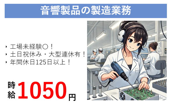 仕事内容 ◆仕事内容 音響機器(スピーカーやアンプなど)をつくる工場でのお仕事です! 担当するのは【部品の取り付け~カンタンな見た目チェック】までの作業! 作業は1つずつの工程に分かれていて、同じことを繰り返す軽作業なので、未経験の方でも安心です! ▼作業の流れ: 【STEP1】半完成品を受け取る 前の工程から流れてきた製品を受け取って、持ち場にセットします。 【STEP2】部品の取り付け マニュアル通りに部品を取り付けていきます。 電動ドライバーを使ってネジを締める作業が中心です。 ※使い方はイチから教えます! 【STEP3】チェック作業 きちんと取り付けられているか、見た目のチェックをします。 動作確認なども簡単な内容なので安心♪ 【STEP4】次の工程へ引き渡し 問題がなければ、製品を次の工程に渡して終了です。 ◇ここもチェック!◇ 急募 即日勤務OK 友達と応募OK 主婦・主夫活躍中 フリーター活躍中 ブランクOK 40代以上応募可 学歴不問 未経験者活躍中 経験者活躍中 研修あり 禁煙・分煙 勤務開始時期調整 車通勤OK 長期 週4以上OK 残業なし 平日のみでOK 長期休暇あり