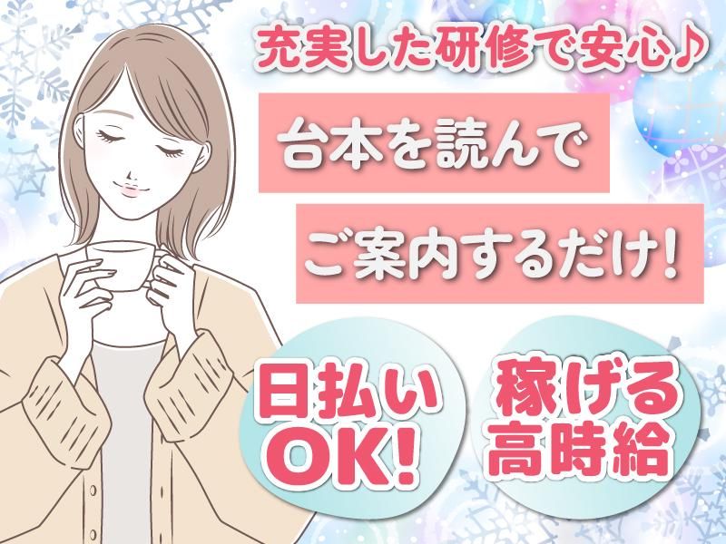 仕事内容 / キレイ×駅チカ×暖かい!(笑) コールセンターがNEW OPEN! 新規事業立ち上げに向けて新メンバーを超積極採用中です✨ \ この冬はしっかり稼げる「コールセンター」で アルバイトを始めてみませんか? 春に旅行やレジャーを楽しむために今から稼ぎたい方も、 新年度に向けてガッツリ稼ぎたい方も大歓迎です✨ オープンしたばかりの新しいオフィスで快適に働けます! (もちろん暖房もバッチリ完備です!!) 【お任せするお仕事は・・・】 意外と簡単>コールセンター未経験も安心! お電話でご案内をするお仕事です! 難しい知識やスキルは不要! トークスクリプト(台本)に沿ってご案内するだけ! ご案内をするのは飲⾷店や⼩売店などに、 簡単な『アンケート調査』のご依頼となります。 対企業様の方向けのご案内のため、 案内がしやすいものポイントです! まずはハキハキと元気に喋ることを意識してみればOK! (最初は恥ずかしいかもですが、スグに慣れます笑) >難しい対応が発生したら・・・ 社員にパスでOK!!! 分からないことがあっても、 すぐに先輩スタッフがお教えします! \\\未経験も安心のサポート体制あり!/// アルバイト3人に付きスタッフが1名専属で付くため、 分からないことや困ったことがあったら、 すぐにフォローをするので安心です! 頼もしい社員がほぼマンツーマン体制で アルバイトさんのサポートをしますので、 コールセンター未経験の方も お気軽にご応募ください✨ 【当社のオススメポイント!】 (1)未経験も⾼時給スタートのオープニング募集 今回の募集では新規事業立ち上げに伴う採用強化のため、 時給1300円〜スタートをお約束しています︕ 簡単なご案内のお仕事なのにしっかりと稼げるので、 時給アップを狙いたいフリーターさんや、 短時間で効率よく働きたい主婦(夫)さんにオススメ✨ 新規事業立ち上げの募集のため、 新しい環境で働きたい方を歓迎しています! 同期入社の新人ばかりで安心して働けます! (もちろん頼れる既存の社員も在籍しています!!) [2]シフト⾃由で働きやすさバッチリ︕ 週1⽇〜、1⽇3時間〜OKなので、 掛け持ち先や家事との両⽴もラクラク︕ お仕事は平⽇のみで⼟⽇祝はお休みなので、 気を遣って⼟⽇のシフトに⼊らなきゃ・・・ なんて⼼配もありません︕ しっかり働いてしっかり休む︕ メリハリを付けて働くこともできますよ︕ [3]急な出費も安⼼︕⽇払いあり︕ 日払い・週払い制度があるため、 急に飲み会や旅行に誘われても安心です⭐ 冬休みに遊びすぎて金欠で大ピンチ・・・ なんてときもご相談ください! (日払い・週払いは規定有) 他にもオシャレ⾃由や交通費全額⽀給など、 メリット満載のアルバイトです︕