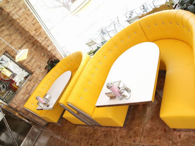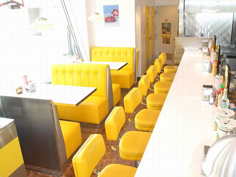 職場環境 ロケや観光、デートスポットとしても 有名な60年代をイメージしたカフェ★ 空に向かって斜めに飛び出た 大きなウインドーとイエローベースの ボックス&カウンターシートが 特徴的なPOPな店内! 映画に出てきそうな U字型ボックスシートも大人気なんですよ♪ 喫煙所:なし(敷地内全て禁煙)