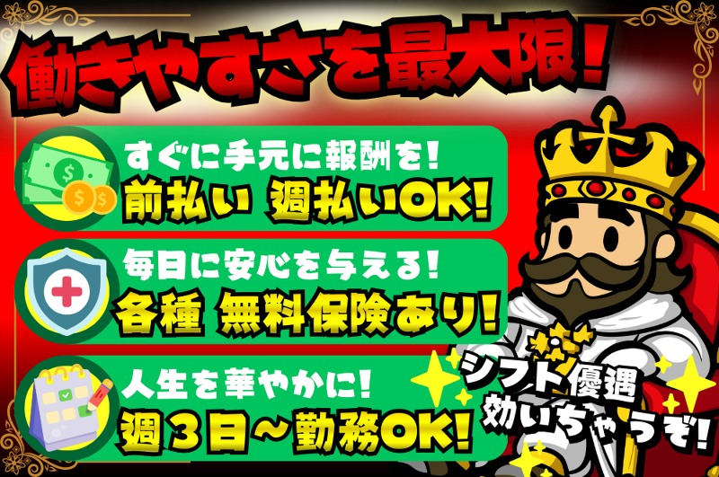 アピールポイント: ✨✨✨✨✨✨✨✨✨✨✨✨✨✨✨✨✨✨ スタートアップキャンペーン❗ 未経験の方以外でも、 入社してから3ヶ月間は、 《 ⭐️ガソリン代を全額負担⭐️ 》しています!!! その分報酬が口座に貯まるので、皆様にお喜びいただいております。 ✨✨✨✨✨✨✨✨✨✨✨✨✨✨✨✨✨✨ ✅ 奇跡の【現金払い】でやる気倍増❗ 「 口座振り込みも可能ですが、それじゃ仕事に身が入らないだろう。」 と、始めた報酬の受け渡しです! 月の頑張りが《札束で渡される》重み、、、。 もう他社には戻れません _:(´ཀ`」 ∠):、、、 ────────────────────────