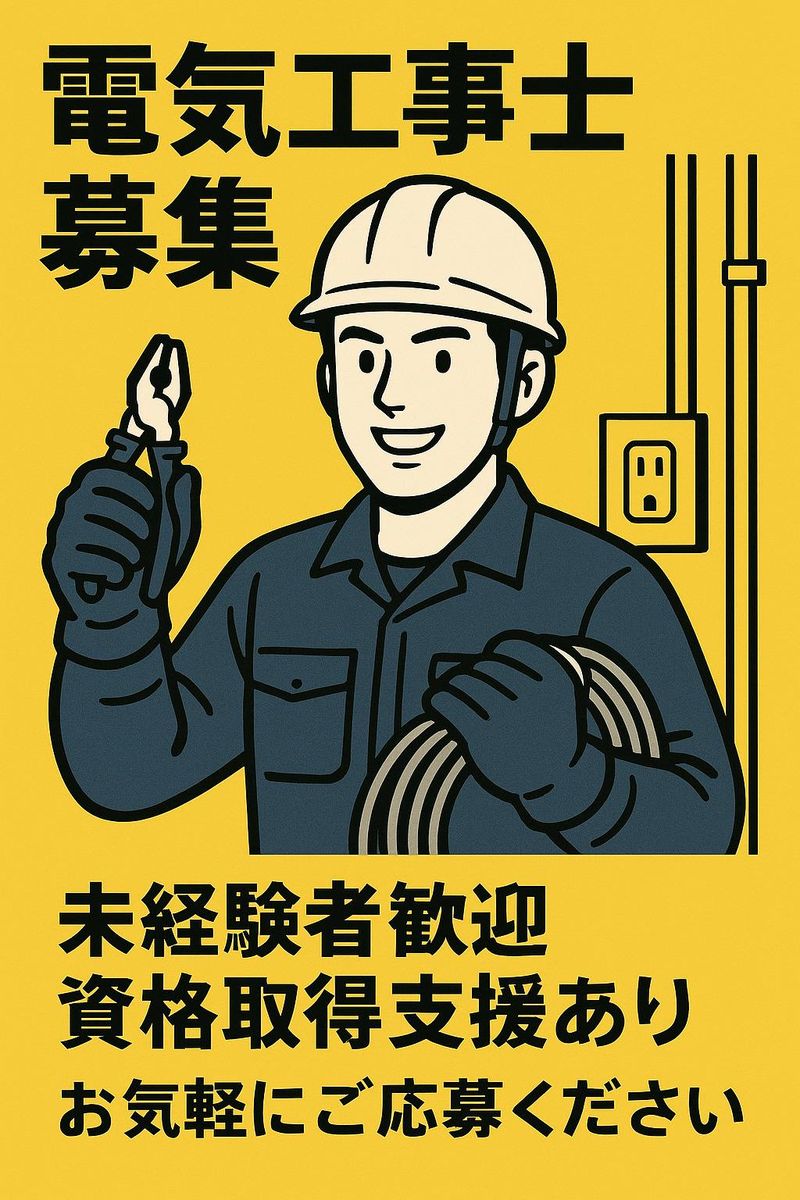 求めている人材 ・電気工事士 ・実務経験不問 ・普通自動車運転免許必須(AT限定可)
