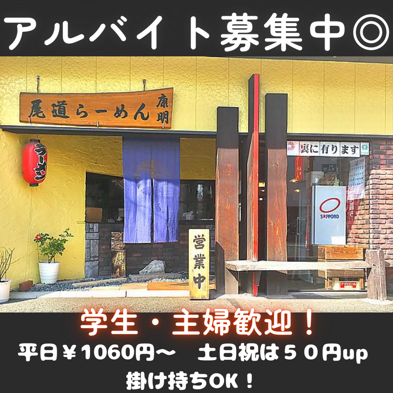 仕事内容 / 人気ラーメン店⭐”尾道ラーメン 康明” 久しぶりにホールスタッフを増員募集❗ 働きやすい環境を用意してお待ちしています♪ \ 【 お仕事内容 】 ラーメン屋さんでのホールスタッフとして、 下記の業務をお願いします。 (具体的には…) ●オープン前準備 店内清掃やセッティングなど。 ●接客業務 お客様を席へご案内したり、料理の提供や お会計業務など。 ●簡単な調理補助 ラーメンにトッピングをのせたり、 洗い物作業など。 《ココがポイント》 ✅ポイント1 食洗機あり!洗い物はラクラクです。 ✅ポイント2 当店は鶏ガラ醤油ラーメンなので、 髪に匂いもつきにくい! ✅ポイント3 ピーク時間も決まっているので、 時間の配分もしやすい! ╭━━━━━━━━╮ ✨注目のメリット✨ ╰━v━━━━━━╯ ⏩希望シフト制! 1週間毎の希望シフト制なので、 プライベートの予定も立てやすいのも魅力です。 学業や家庭との両立も無理なくできます。 ⏩絶品まかないあり! 当店自慢のラーメンをまかないとして 食べることができる嬉しいメリットあり! まかない目当ての方も歓迎します(笑) 更に、休みの日に食べに来た時はサービスあり! ⏩スキマ時間に働けます! 1日3時間~の短時間勤務も可能なので、 時間を有効活用することができます! Wワークにも最適ですよ。 ╭━━━━━━━━━━━━━━━╮ ✨”尾道ラーメン 康明”のご紹介✨ ╰━v━━━━━━━━━━━━━╯ 久留米のラーメンといえば、「豚骨ラーメン」が主流ですが、 当店は広島県尾道市発祥の「鶏ガラ醬油ラーメン」を提供しています! あっさりながらもコクのあるスープに虜になるお客様が続出! 店内はテーブル席・カウンター席を設けており、 落着いた雰囲気となっています。 サラリーマンの方や家族連れ、お友達と一緒になど 幅広い方にご利用いただいております!