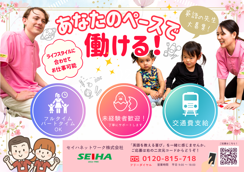 仕事内容 「2026年 オリコン顧客満足度®調査 子ども英語教室 幼児 第1位」獲得 2026年「オリコン顧客満足度®ランキング」で「子ども英語教室 幼児 第1位」を獲得しました。 【英会話レッスン】 0歳から15歳を対象にオリジナルカリキュラムをベースに子どもたちが楽しく英語を学べるよう歌やダンス、ゲームを用いて体を動かしながら楽しくレッスンをしていただきます。 あなたのアイディアも活かして下さい! □0歳~12歳の子どもを対象に少人数制レッスン □外国人講師とのペアレッスン/ソロレッスン □ゲームやダンスを使った英語レッスン などなどをお任せします。 少人数制のクラスなので、アットホームな雰囲気の中で働く事が出来ます! レッスンは「知識」としての英語ではなく、子ども達が自分の考えを「自分の言葉」で表現できる英語を目指しています。 英語が好き!子どもが好き! そんな理由からの勤務も大歓迎です。 資格や経験は不問ですので、一緒に「英語の楽しさ」を伝えませんか? - ・活かせる持ち味 資格やキャリアを活かして、私たちと一緒に働きませんか! 少人数制の教室で一人ひとりの 成長に合わせて指導を行っていきますので子どもたちは個々の目標に向かって取り組みます。 一人ひとりの成長に合わせながら、楽しみながら学習できる環境となっています。 子どもたちの成長を温かく見守る先生として活躍してみませんか?