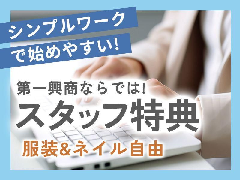 仕事内容 大手企業の第一興商! 安定+高時給で楽しく働こう! \\今回は《採用事務》の募集になります!// *⼦育て世代の⽅が活躍中◎∕* 20代~30代、活躍中☆ ◎時給1300円スタートの⾼収⼊! ◎週4⽇〜OK!1⽇5時間〜OK! ◎採⽤関連に携われる事務スタッフを募集! ◎平⽇のみ勤務!⼟⽇祝休み! ◎"第⼀興商ならではの福利厚⽣で 【仕事内容】 <お任せするのは…> 採⽤関連業務の事務補佐がメインです! ◆求⼈原稿のチェックや⾯接の⽇程調整 ◆電話応対 など PCスキルはタイピングが出来ればOK! ⼦育てが落ち着いたので、 社会復帰をしたい⽅にもおすすめのお仕事です! 過去、採⽤や⼈材関連の業務経験がある⽅はすぐに活躍できますよ! ◆ブランク有でも安⼼して始められます!  ̄ ̄ ̄ ̄ ̄ ̄ ̄ ̄ ̄ ̄ ̄ ̄ ̄ ̄ ̄ ̄ ̄ ̄ ̄ 業務を少しずつ覚えていきながら 段階的に仕事に慣れていただきます。 先輩から「困っていることはない?」と声をかけてくれたり、 質問にも丁寧に答えてもらえる環境なので、 ブランクがある⽅にも安⼼◎ ◆働きやすい環境です☆  ̄ ̄ ̄ ̄ ̄ ̄ ̄ ̄ ̄ ̄ ‧賞与アリ(トレーナーなど役職がある⼈のみ) ‧社割あり(※最⼤50%OFF) ※辞めた後やご家族の使⽤もOK ※当社が運営するビックエコーでも社割が使えます 充実した環境&福利厚⽣あり スタッフみんな仲良し などなど ステキな条件ばかりです!