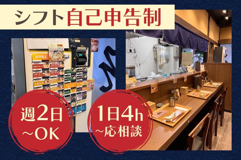 仕事内容 \ お願いするのはディナー帯のみ / ✅週2日~、1日4h~OK ✅食券制でレジ業務ナシ ✅まかない無料(食べ放題) ✅ネイル・ピアス・髪色自由 ✅徒歩5分の好立地&清潔な店内 *―――*―――*―――* お仕事内容 *―――*―――*―――* 基本的に調理業務をお任せしますが、 ホール業務をお願いすることもあります。 ◆麺ゆで・盛り付け(決まった手順で) ◆チャーシューの炙り・具材のトッピング ◆ごはんの量の計量、器の準備 ◆お客様の案内・配膳・片付け ◆食券回収(レジ業務なし) ◆洗い場や店内の清掃 など ⭐ 2名体制で対応 ⭐ ゆとりを持った人員配置のため、 落ち着いて仕事に取り組めます♪ ⭐ 提供の流れ例 ⭐ 食券を受け取ったら 麺を茹ではじめタイマースタート ▼ チャーシューを炙り、器を準備 ▼ タイマー残り20秒で、 器にスープを注ぐ ▼ タイマー終了で麺をあげ器へ盛る 具材をトッピングして完成! ―――*―――*―――*―――*――― おダシと銀しゃり 中華そば 無作 -musa- ―――*―――*―――*―――*――― 24年6月にオープンした、 “出汁の旨味”を活かした中華そばと ふっくら銀しゃりが人気のラーメン店です! あっさり上品なスープは女性客にも好評で、 SNSや口コミでも話題になっています。 店内は清潔感のある和モダンな空間。 無作のラーメンは油っぽさが少ないので、 におい移りの心配もほぼありません。 ✨ POINT ✨ シフトは15日ごとの自己申告制で、 学業・プライベートと両立しやすい環境♪ シフトの相談もしやすいです。 「友達に紹介したくなる職場」と好評◎
