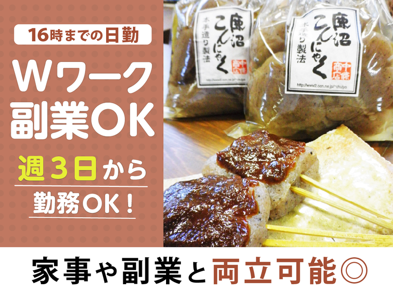 仕事内容 \ルート配送だから道も覚えやすい✨/ AT限定免許でもOK◎運転好きさん歓迎! 勤務時間の相談も可能!副業・掛持ちOK ◆週3日~勤務OK!火~土の勤務多め ◆いろいろなお取引先を回れる◎ ◆女性スタッフや主婦さんも活躍中 *~*~*~*~*~*~*~*~*~* 県内(宇都宮中心)のスーパー、百貨店、 道の駅等に商品を届けるお仕事です! <ルート配送だから安心◎> 曜日によって決められたお取引先に 商品を配送し、現地で、検品・品出し・ 賞味期限チェックなどをお願いします。 *~*~*~*~*~*~*~*~*~* 鹿沼の自然・地元素材を存分に活かし、 伝統を受け継ぐ「鹿沼こんにゃく」。 県内各地の道の駅やスーパー、 百貨店でもお取り扱い頂く等、 多くの方に親しまれています。 伝統の味を届け、鹿沼そして栃木県を 一緒に盛り上げていきましょう◎ *~*~*~*~*~*~*~*~*~* 【雇用形態】 アルバイト・パート 【事業内容】 こんにゃく・ところてんのルート配送 【HP】 http://www.kanumakonnyaku.com/