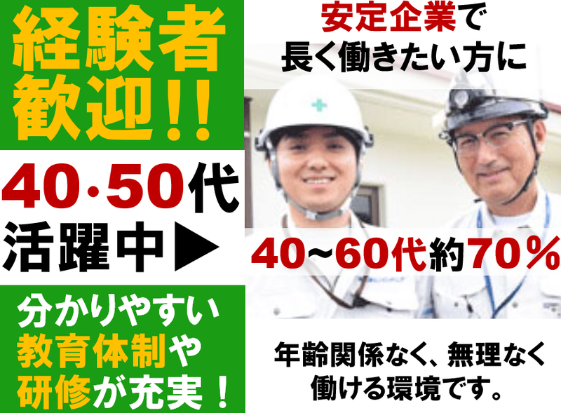 職場環境 シニア活躍中! 40代・50代から入社した従業員多数。 同じ技術者同士困ったときは気軽に相談できる、 そんな心強い仲間に囲まれながら働けるのが特徴です。 裁量が大きく計画的に業務を行える環境。 プロとしてのあなたのやり方を尊重していきます。