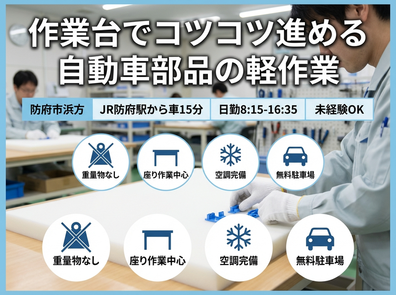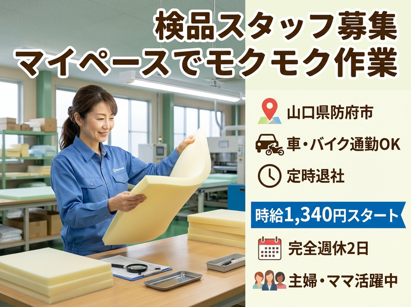仕事内容 工場内で使用される ウレタン素材製品の加工作業サポートをお任せします✨ 扱うのはクッションのように軽い素材で、 作業はすべて作業台を使って行います。 重たい物を持つ作業はありません✅ ⏩具体的な作業内容 加工前の製品を作業台にセット 決められた位置への部品取付・貼り付け作業 加工後製品の見た目チェック(ズレ・汚れがないかの確認) ⭐ 複雑な機械操作なし ⭐ 手順は決まっているので覚えやすい ✨女性スタッフが続けやすい理由 ライン作業ではなく、落ち着いて進められる モクモク・コツコツ作業が中心 未経験スタートの女性スタッフ多数活躍中 「工場は初めて」「久しぶりの仕事復帰」 そんな方も安心して始められるお仕事です⭐