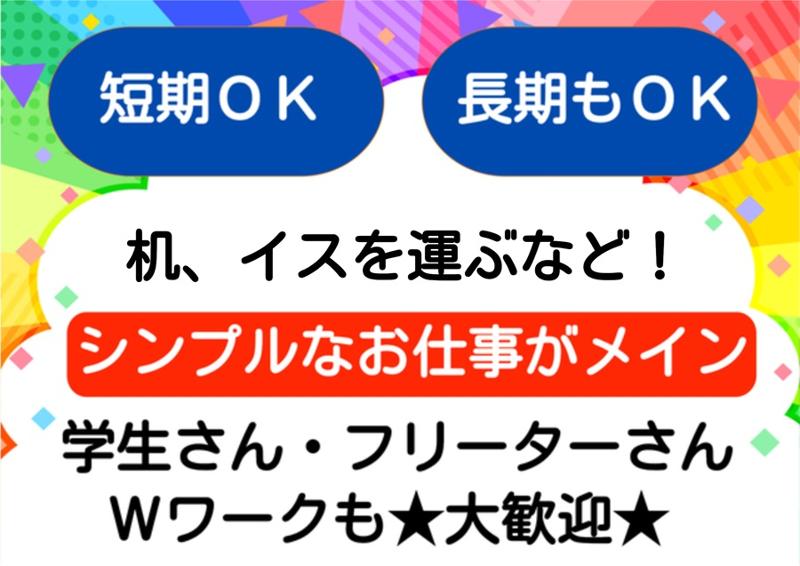 アピールポイント: ・オフィス家具施工経験者、希望者、優遇 【簡単な説明会実施いたします、終了後問題がなければ即登録→シフト提出→仕事依頼となります】 ・給与は週払い ・準備物貸与あり ・短期、単発、週払い、送迎だけじゃないこの仕事の魅力 ・好きなタイミングで働けます! ・仕事が予定より早く終わっても日給は全額保証します! ・短期でもモチロンOK! ・簡単シンプルなお仕事♪ ・働き方はアナタ次第! ・長期は月毎に働く日数が違ってもOK! ・Wワークも可だから、副業にもピッタリ! ・空いてる時間を有効活用! ・しっかり稼げます! ・現場直行も可能です! ・説明会後即日勤務できます! 短期、単発、長期もOK! ★男女20~50代活躍中★ ~早く終わっても日給保証~ ・お給料は週払い! ・欲しい金額に合わせてシフト相談可 ・1ヶ月に2回だけ働く等の日程限定勤務も可♪ ・現場まで社有車を運転できる方は運転手当アリで更に収入UP! ★登録制★ ⇒自分の入れる日だけの勤務もOK! 履歴書も不要!! 現場は違えどやる事は殆ど一緒! だから未経験でも安心! やればやる程、 この仕事の楽しさが分かります! いろんな場所にいけて、 友達と一緒にも働けます! 普通のバイトより未経験や、 単発向けの仕事です★ 業務内容詳細 (1)仙台市内:オフィスの移転作業・商業施設への備品搬入作業 (2)仙台市内:工場の移転作業 (3)仙台市内:各学校の移転作業 (4)各種イベント設営 (5)スーパー、ドラッグストア什器備品搬入 他にも募集しておりますので、まずはお気軽にお問い合わせください。