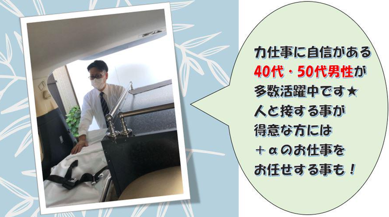 仕事内容 \普通のドライバーとは一味違うお仕事/ ⭐40~50代の男性スタッフ活躍中! ⭐土日含む週2日~OK! ⭐Wワークにも最適 ⭐社員登用制度あり 具体的には ✅安置所や自宅へご遺体の搬送 (病院からご自宅にご希望の時間に合わせて搬送) ✅斎場から火葬場までの搬送 ✅上記業務の他 慣れてきたらPCを使用し日報作成など *埼玉の越谷市周辺エリアの 病院や施設を1~2件程回って頂きます。 上記のお仕事をお任せします。 ご遺族の対応に関しては正社員が行うので 基本的には支持された通りの時間に 病院へ向かったり、次の搬送に向かえば 問題ありません。 私たちはご遺体の搬送を主に 行っているのでドライバーとしての 仕事がない日ももちろんあります。 ”運転は好きだけど毎日はきつい” ”ずっと走りっぱなしは嫌” という方にオススメなお仕事ですよ◎ 担当エリアも近場のみなので 土地勘がない所の運転は苦手な方、 長時間の運転は体力的に… という方もご安心ください! .。.:.。.:.。.:.。..。.:.。.:.。.:.。..。.:.。.:.。.:.。. 【1日の流れ】 出勤後、指示があるまで葬儀場で待機します。 指示が来たら、指定時間に病院へ向かい、 ご遺体をストレッチャーで安置所や 自宅へ搬送します。 コミュニケーションを取るのが得意! という方はご遺族を乗せる 霊柩車の運転もお任せします。 常に細やかな気配りをお願いします。 ❇。・♦・。❇。・♦・。❇。・♦・。❇。・♦・。❇。・♦・。❇ 落ち着いた環境で無理なく働きたい… そんな方にぴったりのお仕事です。 専門的なスキルは必要ありません。 必要なのは“思いやり”と“丁寧な運転”だけ。 40~50代から新しい仕事を始めた スタッフも多数活躍しています。 少しでも興味を持っていただけたら、 まずはお気軽にご応募ください。 あなたのやさしさが、 ご家族の“安心”につながります。