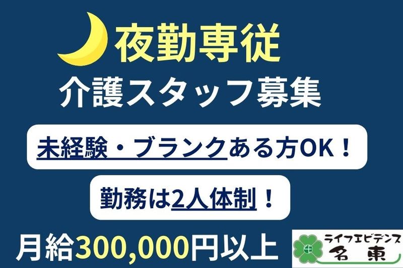 【仕事内容】 夜勤専従の常勤介護職員さん募集! 夜勤は2名体制!未経験の方も、ブランクある方も大歓迎です! ライフエビデンス名東は、名古屋市名東区にある住宅型有料老人ホームです。 当ホームは入居者一人ひとりの声に耳を傾けて、気持ちや意思に寄り添うことを大切にしています。 介護の資格を活かしたい方、子育てが一息つき社会復帰を考えられている方、未経験の方、ブランクのある方でも安心して正社員として活躍できる環境です。 ■具体的な仕事内容 住宅型有料老人ホームでの「夜勤専従」の介護スタッフさんのお仕事です。(2名体制の夜勤です) ・バイタルチェックやお薬管理など健康管理 ・利用者様の巡回と安否確認 ・介護記録 ・起床時の介助やお手洗い誘導 など いきなりの応募は不安な方、まずは事業所・施設見学だけでも大歓迎です。 ご質問なのでお問い合わせもお気軽にご連絡ください。 もっと詳しく知りたい方は、「 合同会社恵 」で検索してみてください! 【求人ID-M03】