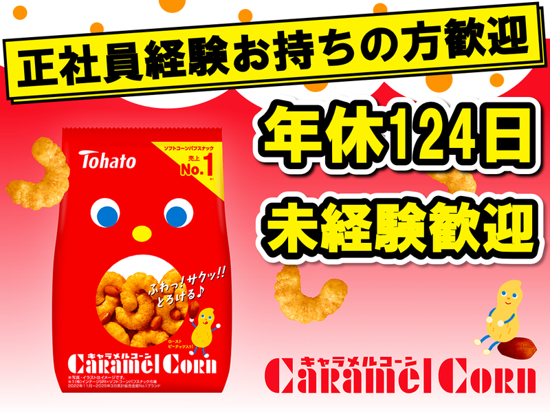 仕事内容 「キャラメルコーン」 「ポテコ」 「暴君ハバネロ」 「ハーベスト」 「チョコビ」 など、 長年愛され続けている お菓子の製造に関わる仕事です! 未経験でも安心のサポート体制で、 あなたの「挑戦したい」という気持ちを 全力で応援します。 原材料から完成品ができるまで、 製造工程の一部を担当していただきます。 身近なコンビニやスーパーで、 自分が手掛けたお菓子を 見つけたときの感動は格別です! 【この仕事のポイント】  ̄ ̄ ̄ ̄ ̄ ̄ ̄ ̄ ̄ ̄ ̄ ✅大手食品メーカーGならではの安定感! 売上8年連続アップの成長企業 ✅やりがい◎! 自分の作ったお菓子が全国で愛されます ✅メリハリある働き方! 土日祝休み&長期休暇ありで プライベートも充実 ✅高待遇! 昨年賞与実績4.0ヶ月分+家族手当や 住宅手当も支給 ✅未経験歓迎! 丁寧な研修があるから安心スタート ✅生活サポートが充実! *自己負担わずか1万円で住める独身寮 (30歳未満の方/規定有) *社員食堂で美味しいランチ (1食300円ほど) *車通勤OK+駅から送迎バスあり ✅転勤無し! 埼玉県の工場1ヶ所で腰を据えて就業可能 【具体的なお仕事の内容】  ̄ ̄ ̄ ̄ ̄ ̄ ̄ ̄ ̄ ̄ ̄ ̄ 未経験でも取り組みやすい以下の工程を お任せします! ■仕込:原材料をミキサーに投入し、 生地を作ります ■焼成:成型機やオーブンを操作し、 生地を焼き上げます ■包装:包装機を使って、 製品をパッケージングします ※先輩スタッフが マンツーマンでサポート! 機械操作や作業手順を しっかり教えるので、 無理なく仕事を覚えられます。 【成長とキャリアアップを全力サポート】  ̄ ̄ ̄ ̄ ̄ ̄ ̄ ̄ ̄ ̄ ̄ ̄ ̄ ̄ ̄ ̄ ̄ ̄ ̄ 未経験から始めても、着実にキャリアを 築けます! ■班長(主任) …20代後半~30代前半で昇格を目指せます ■係長・課長 …30代後半~40代前半で製造部門を まとめる立場に! また、適性に応じて 品質管理や設備保全など、 専門性を活かせるキャリアにも 挑戦できます。 【未経験者のリアルな声をご紹介!】  ̄ ̄ ̄ ̄ ̄ ̄ ̄ ̄ ̄ ̄ ̄ ̄ ̄ ̄ ̄ ̄ ̄ ■Aさん(前職:飲食店勤務) 「調理師として働いていましたが、 コロナ禍で将来に不安を感じ、 安定性のある東ハトに転職しました。 収入がアップしただけでなく、 クルマ通勤になり通勤時間も 快適になりました!」 【私たち東ハトについて】  ̄ ̄ ̄ ̄ ̄ ̄ ̄ ̄ ̄ ̄ ̄ ̄ 『ひとりのお菓子好きとして、 心から納得できる商品を作る』。 これが私たちの変わらない理念です。 製法、原材料、品質、 すべてにこだわり抜き、 全国のお客様に愛される商品を 届けています。 現在、売上は8年連続アップと好調! 社員数も年々増加し、 ますます成長しています。 お菓子が好きなあなた、 ぜひ私たちと一緒に、 お菓子で人を幸せにする仕事に 挑戦してみませんか?