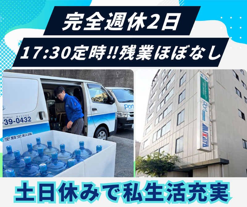 固定時間制 勤務時間詳細 実働時間:1日あたり8時間 平均勤務日数:1ヶ月あたり21日 勤務時間:8:30~17:30 (休憩時間 1時間00分) 【1日の流れ(例)】 ✅8:30/出社後、伝票確認・ルートチェック、ボトルや備品を積み込んで出発。 法人・個人のお客様先を訪問し、配送と点検を行います。 ✅12:00/昼食休憩。 ✅13:00/午後の訪問スタート。 ✅16:00/帰社後、回収した空ボトルの荷下ろし、翌日分のボトル・部品の積み込み。 ✅16:45/日報入力、売上集計、翌日の準備。 ✅17:30/退勤。残業はほとんどありません。 ★1日20~30件ほど。1件あたりは10~15分です♪