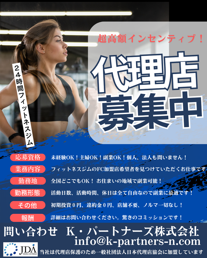 仕事内容 個人・法人問わず フィットネスジムの加盟店を獲得する営業をお任せいたします。 ・営業活動は空いている時間でOK。 ・副業での営業OK。 ・主婦の方でもOK。 ・月間、年間のノルマ一切なし。 ・店舗不要 ・契約金一切なし。 ・解約金、違約金一切なし。 ・商品や商材の購入なし。 ・本社への訪問なし。 ・説明はWEB、対面で可能。 ・研修なし。 -希望があればWEBで研修は可能です。 ・加盟店希望者の発掘・提案 - 個人・法人の開業希望者に24時間ジム運営に関する説明をしていただきます。 -既存ビジネスの追加収益として提案(不動産、企業、建設業、投資家など) (運営や収支しに関する細かい説明は本部で行います。) ・本部とご紹介者様との面談(WEB・対面)日程の調整を行なっていただきます。 -同席も可能です。 ・既存ネットワークの活用・紹介営業 -ご家族、ご友人、知人、同僚の方をご紹介いただくだけでもOKです。 ・フィットネスジムの出店ができる店舗の内見 -ご紹介者と面談を行い、出店の意思確認が取れてからとなります。 ・営業手法はは自由です。 -自分のネットワークを活用した紹介営業 -企業訪問・提案(法人営業) -SNSやセミナーなどを活用した集客型営業 -異業種交流会や展示会での営業活動 ・加盟店契約の締結で高額インセンティブ! -成功報酬型なので固定費ゼロで始められます。 【ご紹介者】 ①フィットネスジムの開業をご検討している個人・法人様のご紹介 ②何かしらの加盟店事業をご検討されている個人・法人様のご紹介 ③副業や不労所得をご検討されている個人様のご紹介 ④新規事業や事業の拡大をご検討されている法人様のご紹介 ⑤土地や建物を所有し、有効活用をご検討されている家主様のご紹介
