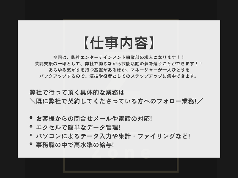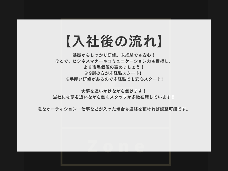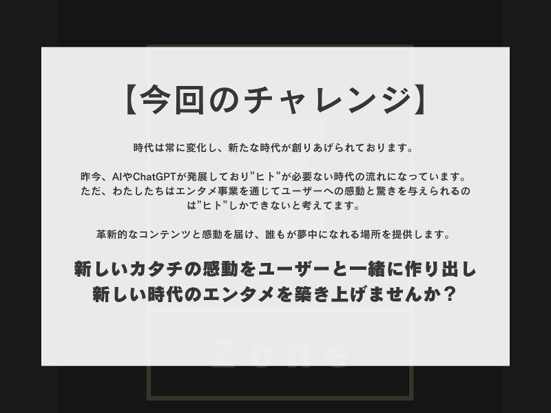 アピールポイント: 事業拡大に伴う増員です。(1/12在) 【今回のチャレンジ】 時代は常に変化し、新たな時代が創りあげられております。 昨今、AIやChatGPTが発展しており”ヒト”が必要ない時代の流れになっています。 ただ、わたしたちはエンタメ事業を通じてユーザーへの感動と驚きを与えられるのは”ヒト”しかできないと考えてます。 革新的なコンテンツと感動を届け、誰もが夢中になれる場所を提供します。 新しいカタチの感動をユーザーと一緒に作り出し新しい時代のエンタメを築き上げませんか?