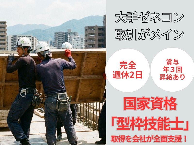 仕事内容 ✅完全週休2日×年間休日111日 ✅ 日勤のみ&福岡市内勤務で生活リズム安定 ✅ 道具の名前からしっかりレクチャー! ⭐ 仕事内容 ─────────────── 【どんな仕事?未経験でもOK?】 最初は道具の準備や片付け 型枠の受け渡しなど、 かんたんな作業からスタート! 作業はチームで行うので、 いきなり難しい作業を 任されることはありません。 ※主な現場は福岡市内となります。 ※年間安定した業務量の為、 出張等はございません。 ※3~5名のワンチームで 作業を行っていただきます。 ⭐型枠大工って? ─────────────── 何もない場所に「ゼロから」 モノを造り上げていく仕事です。 建物の土台づくり、基本の基を 作り上げるのが我々の仕事です! この土台がなければ、建物の工事 を進めることができません! 重要な役割を担っています◎ ー誰かの暮らしを支える 形に残る仕事ー 自分の関わった建物が 完成するたびに達成感を味わえます! ⭐入社後の流れ ─────────────── 入社後は、基礎から しっかり学べる教育体制を 整えています。 STEP1|入社1~2ヶ月目 現場見学・安全研修、 工具の使い方を学びながら、 先輩のサポートのもと 簡単な作業からスタート! STEP2|入社3~6ヶ月目 図面や資材の扱い方を覚え、 型枠の組立補助へステップアップ。 先輩が横でフォローするので 不安はありません。 STEP3|1年目以降 作業を一通りできるようになれば、 国家資格「型枠技能士」 取得を会社が全面支援! “技術職として一生モノのスキル” を磨けます。