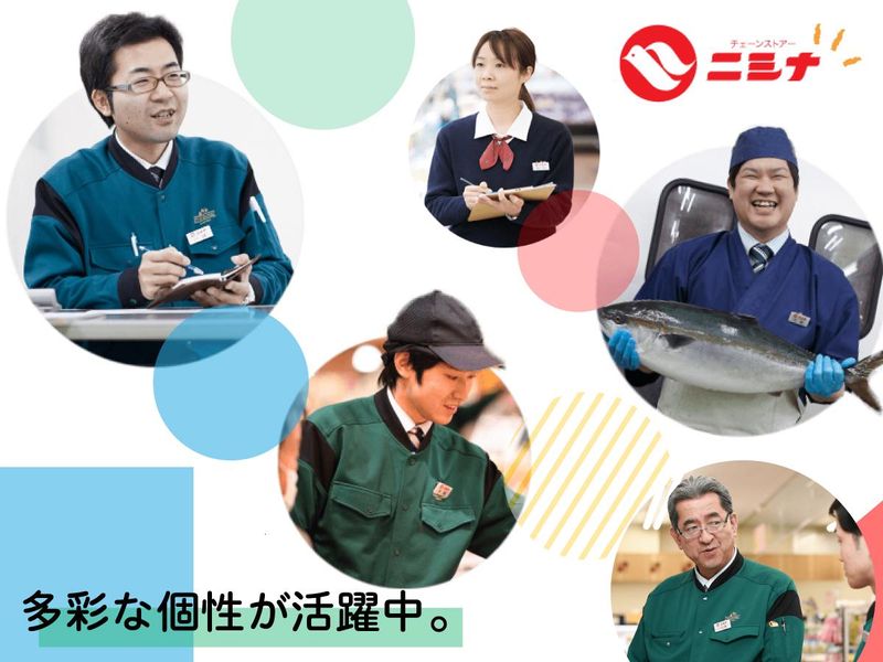 職場環境 社員だけでなくパートアルバイトを含め、幅広い年齢層、様々な社歴の方が働いているニシナ。昔から、年齢や経験に関係なく個人を尊重する風土があります。上も下もなくコミュニケーションが取れているから、売り場スタッフから始まる取り組みが多いのも、当社の特徴です。 喫煙所:喫煙所あり(屋外) 屋外の指定場所での喫煙が可能です