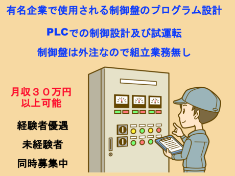 お仕事内容 産業用機械の制御盤に入れる制御プログラム作成 ・大手メーカーの工場内で使用する制御盤のPLC設計やタッチパネルプログラム作成、実装試験までを行って頂きます。 ・工場機械の改修もありますので、多少作業服が汚れる場合がありますが、危険な仕事はありません。 ・制御盤本体の製作はありません。制御盤の中に入れるプログラム制作と実装・試運転のみを行って頂きます。 ・男女問わず、技術のある方を募集中です。 ・長期で働いて頂ける方を募集しています。 [EN2420] ********************************************************* まずはお気軽にご相談ください! <電話でのお問い合わせ> フリーダイヤル:0120-888-979(受付時間:9:00~17:00)まで