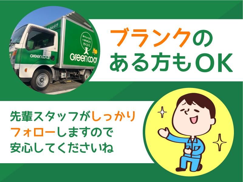 仕事内容 \ドライバー未経験も大歓迎♪ / ━━━━━━━━━━━━━━━━━━ 求人のポイント ━━━v━━━━━━━━━━━━━━ □ 普通免許(AT限定可)でOK □ 配達は1日50件程度 □ 長距離や深夜の運転ナシ □ 固定ルートで安心♪ (^^) □ 主婦さん多数活躍中 ━━━━━━━━━━━━━━━━━━ * <仕事内容> ご注文いただいたグリーンコープの食品や 日用品などを組合員にお届けするお仕事! 次回分の注文書を回収したり、 組合員様と世間話を交えながら 新商品のキャンペーンのご紹介もします♪ お届け先が不在の場合でも 保冷箱に入れておくので、 再配達がなく残業は少なめです。 入社後は、先輩の運転に同乗して ルートや運転の仕方、1日の流れなどを 覚えていきましょう◎ 分からないことは丁寧に教えますし、 少しずつ慣れていけば大丈夫です◎ 当社では、入社2~3年目の方でも リーダーに抜擢されたケースもあり! 意欲的に頑張っている方は 積極的に評価していきますので、 素早い昇格も目指せますよ。 \ ポイントまとめ / ●組合員様の在宅は2~3割! 不在時は玄関先に置けるので再配達ナシ ●基本土日休み(完全週休2日制) ●勤務日数・時間は要相談! ●産前・産後・育児休暇あり ●フルタイム勤務の選択も可(要相談) ――――( 採用担当者 よ り )――――― 新しく入ってきた方が 安心して働けるように、 声掛けやコミュニケーションを 大切にしています。 (※新人さんは朝礼で ちゃんとみんなにご紹介し みんなでフォローし合える体制と 風土が自然にできています(^^)) トラックを運転したことがなかった という未経験入社の方ばかり。 年齢・社歴関係なく 困っている人がいれば手を差し伸べたり、 切磋琢磨できる仲間が待っていますよ!