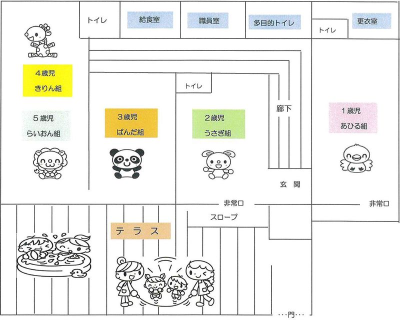 職場環境 定員 60名(1歳児~就学前) 1歳児(あひる組) 10名 2歳児(うさぎ組) 11名 3歳児(ぱんだ組) 13名 4歳児(きりん組) 13名 5歳児(らいおん組) 13名 合計 60名 職員構成 園長 1名 保育士 12名 栄養士 3名 調理員 2名 喫煙所:なし(敷地内全て禁煙)