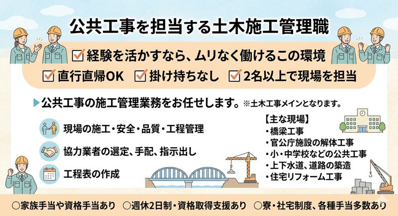 【仕事内容】 【経験を活かすなら、ムリなく働けるこの環境】 ✅直行直帰OK ✅掛け持ちなし ✅2名以上で現場を担当 ▶公共工事の施工管理業務をお任せします。 ※土木工事メインとなります。 【具体的には】 ・現場の施工・安全管理、品質管理、工程管理 ・協力業者の選定、手配 ・職人さんへの指示出し ・工程表の作成 など 【主な現場】 ・橋梁工事 ・官公庁施設の解体工事 ・小・中学校などの公共工事 ・上下水道工事、道路の築造工事 ・住宅リフォーム工事 など ============================ 培った技術と経験を活かせる場所がここにある 現場を知るあなたの力が必要です! ============================ 土木施工管理のご経験がある方はぜひご応募ください! 〇家族手当や資格手当あり 〇週休2日制・資格取得支援あり 〇寮・社宅制度、各種手当多数あり 充実の福利厚生で働きやすさも抜群。頑張ってスキルアップをした分は、資格手当もありますのでぜひご活用ください! ======================= 効率的に働いて、しっかり休める職場! ======================= 〇現場へは直行直帰で移動の負担軽減 〇現場の事務所内で事務処理が可能 など、業務のムダを省き、社員の負担を最小限にすることで、基本定時退社を実現。 残業は月10~20時間程度と少なめで、案件が一区切りついたら長期休暇の取得も可能です! ▶あなたのご応募お待ちしております! 【求人ID-MFB】