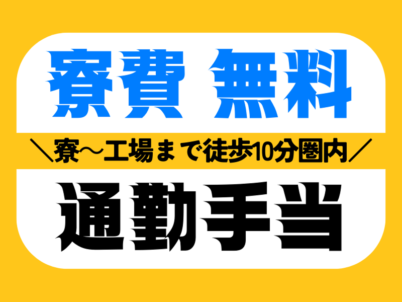 アピールポイント: 月給なので毎月安定した収入! 残業少なめで嬉しい! 土日休みでプライベート充実まったなし! * 年3回の長期休暇 * うれしい寮費無料 * 赴任交通費支給 * 引っ越し費用最大5万円補助 * 寮から工場まで徒歩10分圏内 * 車通勤可能 * 交通費規定支給 ===前払い制度あり=== 日払いも、週払いもOKです! 今月ピンチ…そんな時に超便利! スマホのアプリでサクッと申請! \お気軽にご相談ください!/