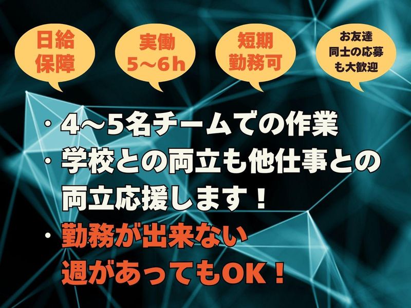 求めている人材 簡単な事から教えていきます。 4~5名の増員募集! 4~5人での現場作業なので特別な知識や経験がなくても大丈夫です。 できることからコツコツと覚えてください。 週1日~OK! 学校と両立しながら働くスタッフも多数! 早く終わることも多々あり! もちろん日給は保障します! 基本8:30に集合して、17:00には会社で解散しています。 どんなに早く終わっても日給は保障! もし残業がある場合は1時間につき1600円~支給♪ 近隣に住んでる方が多く、自転車やバイクで通勤するスタッフも多数。 鶴見、生麦、大口、川崎などから通勤するスタッフ多数。 自分の都合の良い日にお仕事ができます。 学生・副業・フリーターさん、みんなが働きやすいように希望シフト制です。 この曜日しか働けない!などあっても融通がきくので、芸能活動と両立するスタッフもいました。 希望収入や希望勤務日はできるだけ考慮しています。 ★都合をつけて働きやすいので定着率の良い会社です。