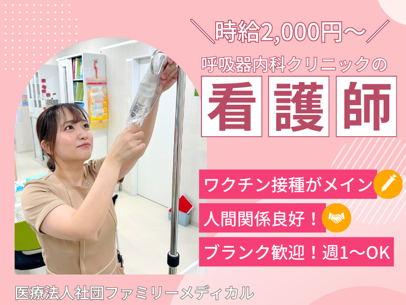 仕事内容 \ワクチン接種メインのスタッフ大募集/ 資格を活かして、安心して働ける環境です。 ◆主な業務内容 ・ワクチン接種 ・採血(1日10件前後) ・呼吸機能検査(検査前の準備・患者さまの簡単なサポート) ・心電図 など 業務フローが決まっているので不安なくスタートできます。 ※入職後は、無理のないペースで少しずつお仕事をお任せしていきますのでご安心ください。 安心して働けるポイント ■ ブランク明けもOKの“安心サポート” 困ったときはその場で相談できる環境です。 業務が一人に集中せず、無理のない体制を整えています。 ■ 安定していて働きやすい外来業務 慢性疾患で定期的に通院される患者さまも多く、 一人ひとりと丁寧に関わる看護ができます。 ■ 資格をしっかり活かせる ワクチン接種・採血・吸入指導など、 日々の業務で看護スキルを活かせます。 呼吸器内科未経験でも働きながら知識が自然と身につきます。 ■ こんな方に選ばれています 病棟や夜勤から離れて、生活リズムを安定させたい方 ブランク明けで、まずは無理なく現場復帰したい方 限られた時間で、高時給で集中して収入を得たい方 ◆勤務条件 ・週3日以上、終日勤務できる方 歓迎 ・勤務曜日、時間帯は相談可 ・子育て中のスタッフも在籍(学校行事など柔軟対応) ☆駅徒歩1分で通勤しやすい立地です☆ \まずは見学だけでも大歓迎/ 「資格を活かして働きたい」 「安心して続けられる職場を探している」 そんな方にピッタリな環境です。 少しでも気になった方は、ぜひお気軽にお問い合わせください。