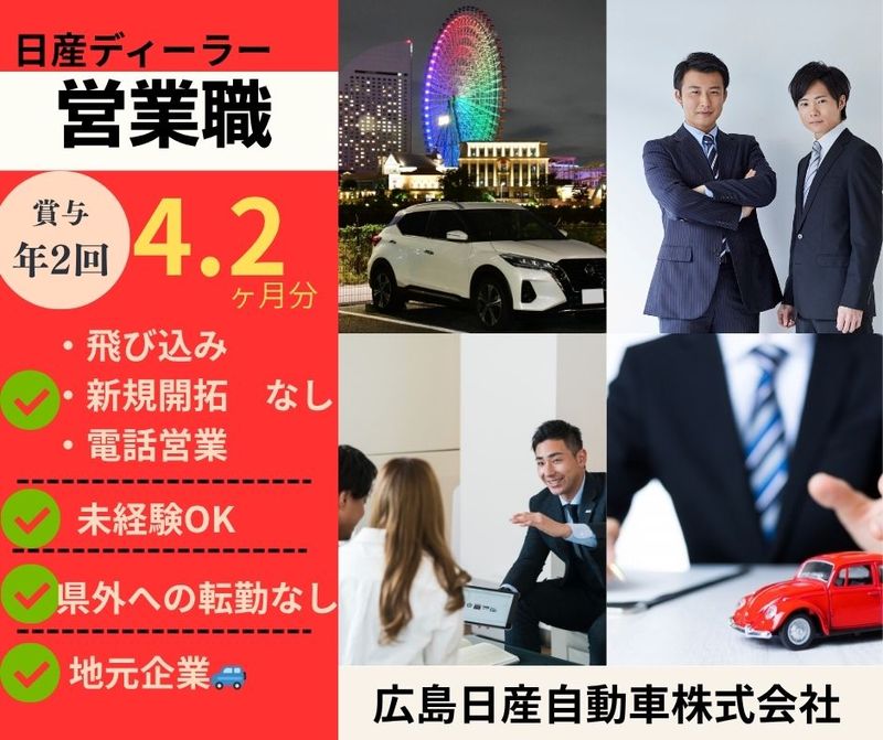 メッセージ \営業未経験から活躍できます/ \こんな方に向いています/ ★人と話すことが好きな方 ★喜んでもらうことが好きな方 【既存顧客メイン!】 飛び込みや新規開拓、 電話営業ではありません! 主には来店された既存のお客様へ 接客、提案や 車検等の契約しているものの時期が 近づいてきたお客様へお電話する等 また、お得意さまから知人やご家族などを ご紹介していただくこともあります 親身になって寄り添い、真摯にお話を伺う 聞き上手の社員が活躍しています ▽▽▽▽▽▽▽ ☆こちらのお仕事は、 企業様からお預かりし 転職エージェント『しごと計画学校』が ご紹介するお仕事です 『しごと計画学校』については 下記「その他欄」に記載しておりますので ご参考ください 日産の自動車販売・営業職募集!経験問いません〇日産車が好きな方、大歓迎☆ 労働者派遣事業(派33-300443) 職業紹介事業(33-ユ-300208)