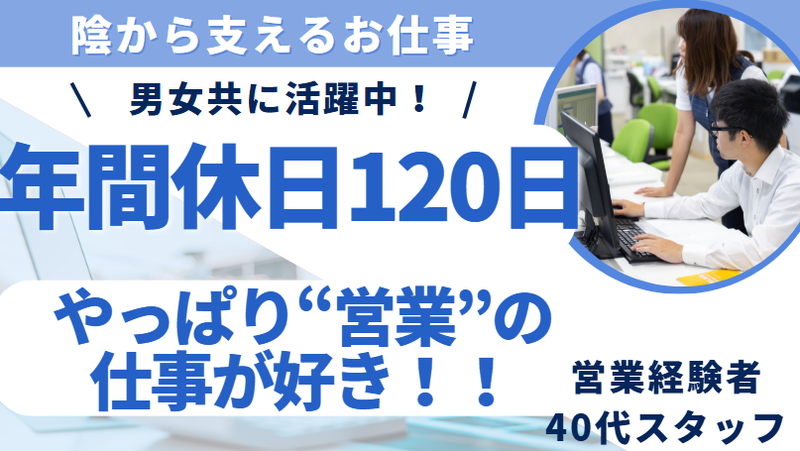 求めている人材 30~40代活躍中! 若手よりも、経験値や人柄を 重視した採用です。 【必須条件】 ・要普通免許(AT限定可) ・営業経験のある方 【歓迎条件】 ・新しい環境や人との出会いを求めている方 ・フットワークが軽い方 ・関係構築型の営業が好きな方 ・最後の就職先にしたい ・営業経験を活かしたい ・ブランク、異業種からの転職に挑戦したい <こんな経験・スキルが活かせます> ・ルート営業 ・法人営業 ・接客 ・PCスキル ・資料作成 ・商談 ・アポイント ・外回り