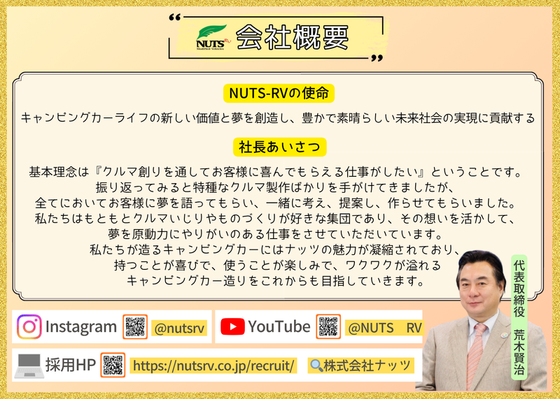 仕事内容 \お客様の夢のスタートに立ち会うお仕事/ ✨【店舗事務スタッフ募集】✨ ✅納車は1年待ち!国内シェアNo.1のキャンピングカー専門メーカー◎ ✅設立1998年!成長を続ける安定企業!国内4つ目の新工場も稼働予定◎ ✅仕事も遊びも全力!年休120日以上&残業ほぼなしでメリハリのある働き方◎ ✅会社情報など随時更新中!事前に雰囲気をチェック♪ ================ *Instagram『@nutsrv』 *YouTube『@NUTS RV』 *採用HP『株式会社ナッツ』で検索 ================ 「ただの事務」じゃ、物足りないあなたへ! 国内トップクラスのシェアを誇るキャンピングカーメーカー。 私たちが届けているのは、「人生を変える体験」そのものです! 新しい生き方に挑戦したい人。夢だった旅に踏み出す人。 その一人ひとりの想いに、真正面から向き合い、形にしていくのがこの仕事の魅力です! 成長を続ける環境で、誰かの夢を支えるやりがいを感じませんか?✨ 【⏬仕事内容】 国内最大級のキャンピングカー製造販売メーカー【ナッツRV】の各店舗を支える、事務業務をお任せします! ≪具体的に…≫ ■お客様対応(電話・来店時のご案内) ■入出金管理などの経理業務 ■車両登録に関する書類作成 ■営業スタッフのサポート業務 ■サービスフロントのサポート業務 など 単なるデスクワークではありません! 営業が契約を結ぶその前から、納車の瞬間までお客様の体験に関われるやりがいのある仕事です✨ 【⏬ここがナッツで働くポイント】 ✨少人数制のチームでやりがい◎任されるから面白い! 業務ポジションは各店舗3~4名体制の少数精鋭チームで働いています! 自分で考え、工夫しながら主体的に動ける環境があり、「どうすればより良くなるか」を考えられる方にはやりがいのある仕事です。 また、チーム内で助け合う風土が根付いているため、困ったときはしっかりサポートし合えます。 無理なく業務に取り組める環境だと、社員からも好評です◎ ✨圧倒的なリーダーシップと支え合うチームの強さ! ナッツRVの特徴は、スピード感と実行力。その中心にいるのが荒木社長です! 「この人についていきたい」と思わせる圧倒的なリーダーシップで、掲げた考えが次々と形になっていきます。 そんな想いを共有し、本気で実現していく上層部の姿にも日々刺激を受けられる環境です。 また、キャリアアップの機会も豊富で、すべての社員に公平にチャンスがあります!20代で課長に昇進したスタッフも◎ ✨思いっきり仕事をして思いっきり遊ぶ会社! 魅力ある会社づくりを目指しています。 年間休日120日以上&基本は毎日定時退社。趣味の時間をしっかり楽しんでいる先輩も多数◎ 仕事が充実しているからこそ、プライベートもより充実させることができます✨ さらに「ナッツに入って良かった!」と思ってもらえるよう、社員全員で海外旅行に行ったり、釣りやキャンプ、音楽フェス、BBQなどのイベントを実施したり、 社員向けレンタルキャンピングカーなど、さまざまな取り組みにチャレンジし続けています。 ≪⏰社員専用キャンピングカー無料レンタルとは…≫ ナッツRVで働く最大の魅力は、家族や友人と自由に旅を楽しめること! 社員は全国に56台あるレンタルキャンピングカーを利用でき、車中泊や旅を満喫しながら、キャンピングカーの魅力を実体験できます。 実際に使用することで性能への理解も深まり、仕事にも活かせますよ♪ さらに長期休暇制度も充実しており、昨年は夏季休暇14日連続取得を実現! ゆとりあるキャンピングカーライフを楽しめる環境づくりを進めています✨ 【⏬社員インタビュー(20代/Kさん)】 Q:入社のきっかけは? A:介護施設の事務員として働いた後、進路に悩んでいた際に父から「ナッツはどう?」と紹介され入社しました。 幼い頃からキャンピングカーで家族旅行を楽しんできた経験があり、その思い出を今度は自分がお客様に届けたいと思ったのが決め手です。 父への感謝とともに、お客様の思い出づくりに関わりたいと考えています! Q:仕事のやりがいは? A:朝礼準備から始まり、電話・メール対応、書類作成、備品管理、お客様対応など幅広い業務を担当しています。 来店時には、自身のキャンピングカー経験を活かした会話でお客様と距離が縮まることも! イベント対応も含め、人との関わりやチームワークの中にやりがいを感じています! 特に、旅行帰りのお客様からお話を聞く時間が一番楽しいです♪ Q:職場の雰囲気は? A:業界未経験で最初は不安でしたが、入社当初から先輩に質問しやすい環境があり、安心して働けています! 社員同士の距離も近く、社員旅行では自由行動で楽しむなど、リラックスした雰囲気も魅力です♪ Q:どんな方に向いてる? A:明るく、人と関わることが好きな方に向いている仕事です! お客様との会話や、社内での連携も多いため、コミュニケーションを大切にできる方が活躍できます。 また、自分で考えて行動したい方や、前向きに新しいことへチャレンジできる方にもぴったりの環境です